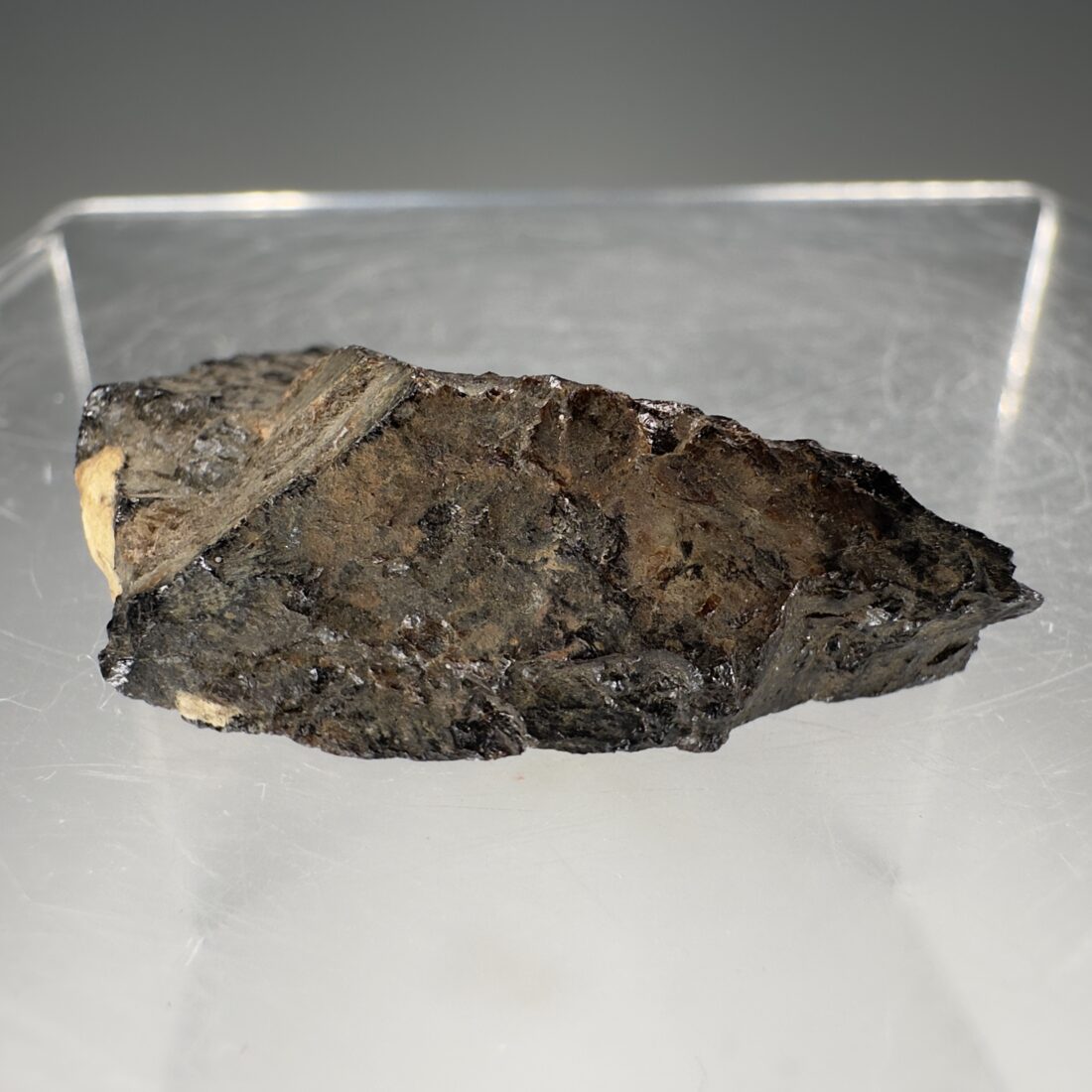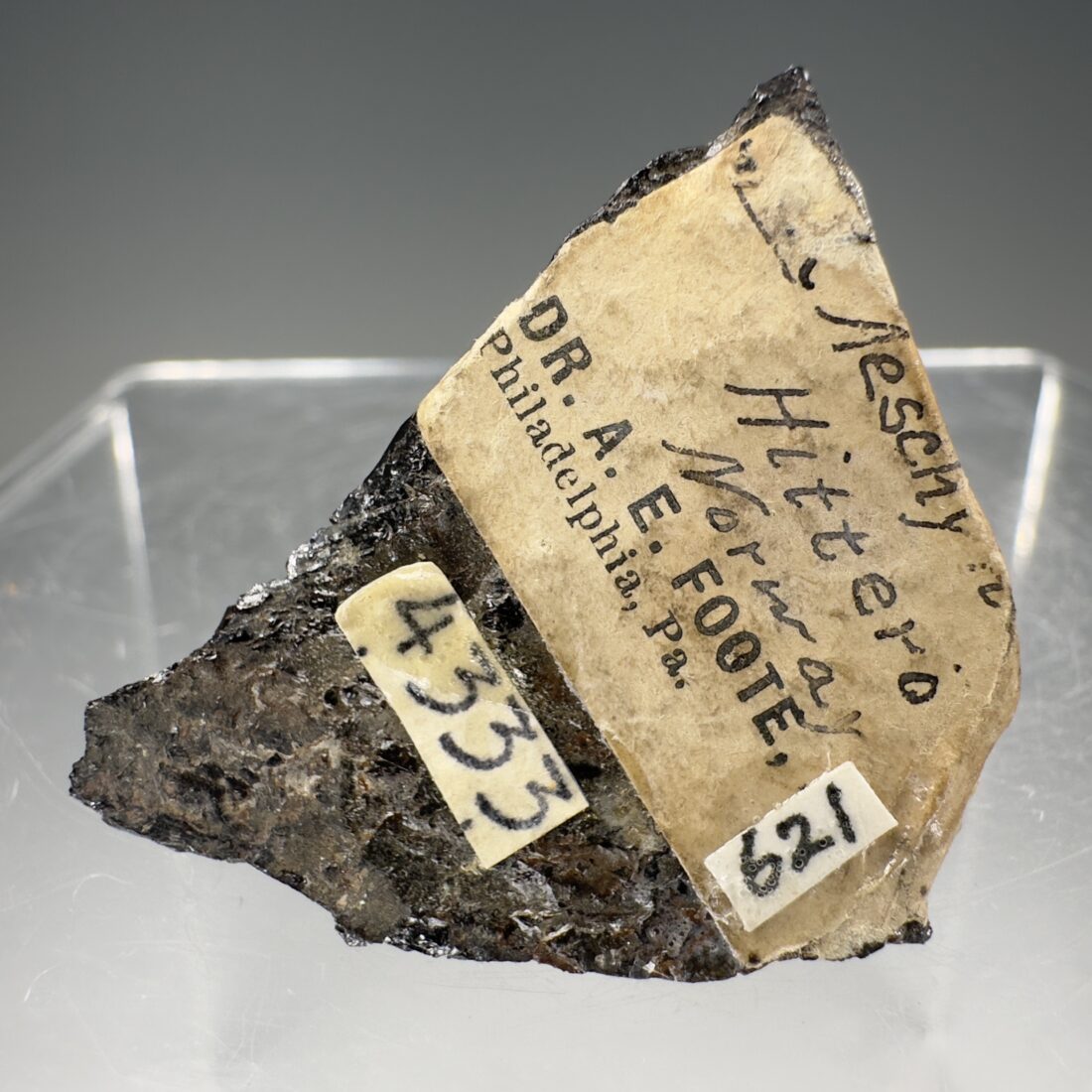 Very nice old-time specimen of Aeschynite-(Y) from the Urstad Feldspar Mine, Hidra, Flekkefjord, Agder, Norway. Has a 19th century hadwritten A.E. Foote label affixed to one side. Classic!!