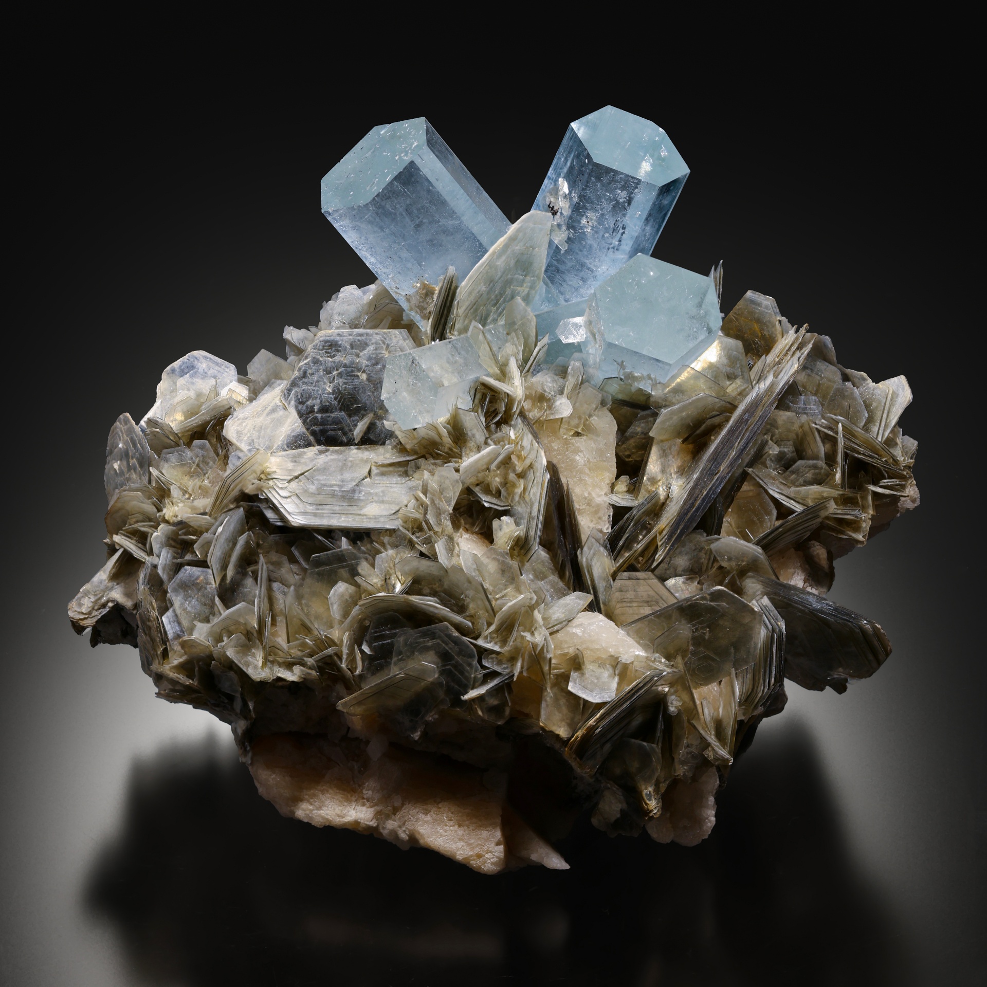 Gorgeous, flower-like cluster of undamaged gem aquamarine crystals to ~4.5 cm. on well-crystallized muscovite matrix on microcline from the famous Chumar Bakhoor locality in northern Pakistan. Wonderful quality for a matrix aquamarine from this important locality. Mark Cross photo.