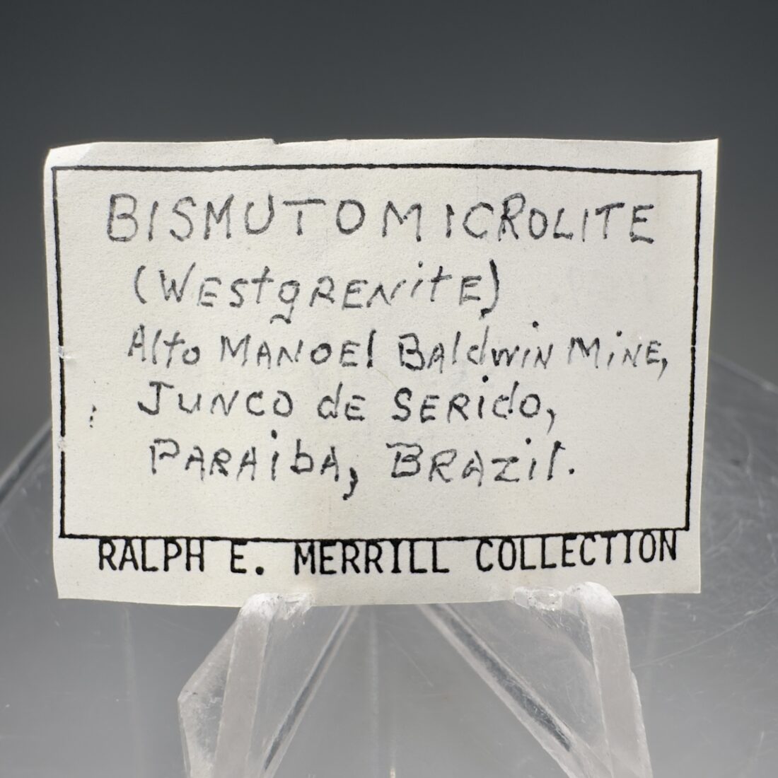 Very nice and rather large for the species single crystal of Bismutomicrolite from the Alto Quixaba claim, Quixaba, Frei Martinho, Paraíba, Brazil. Ex. Ralph Merrill collection. Rare!