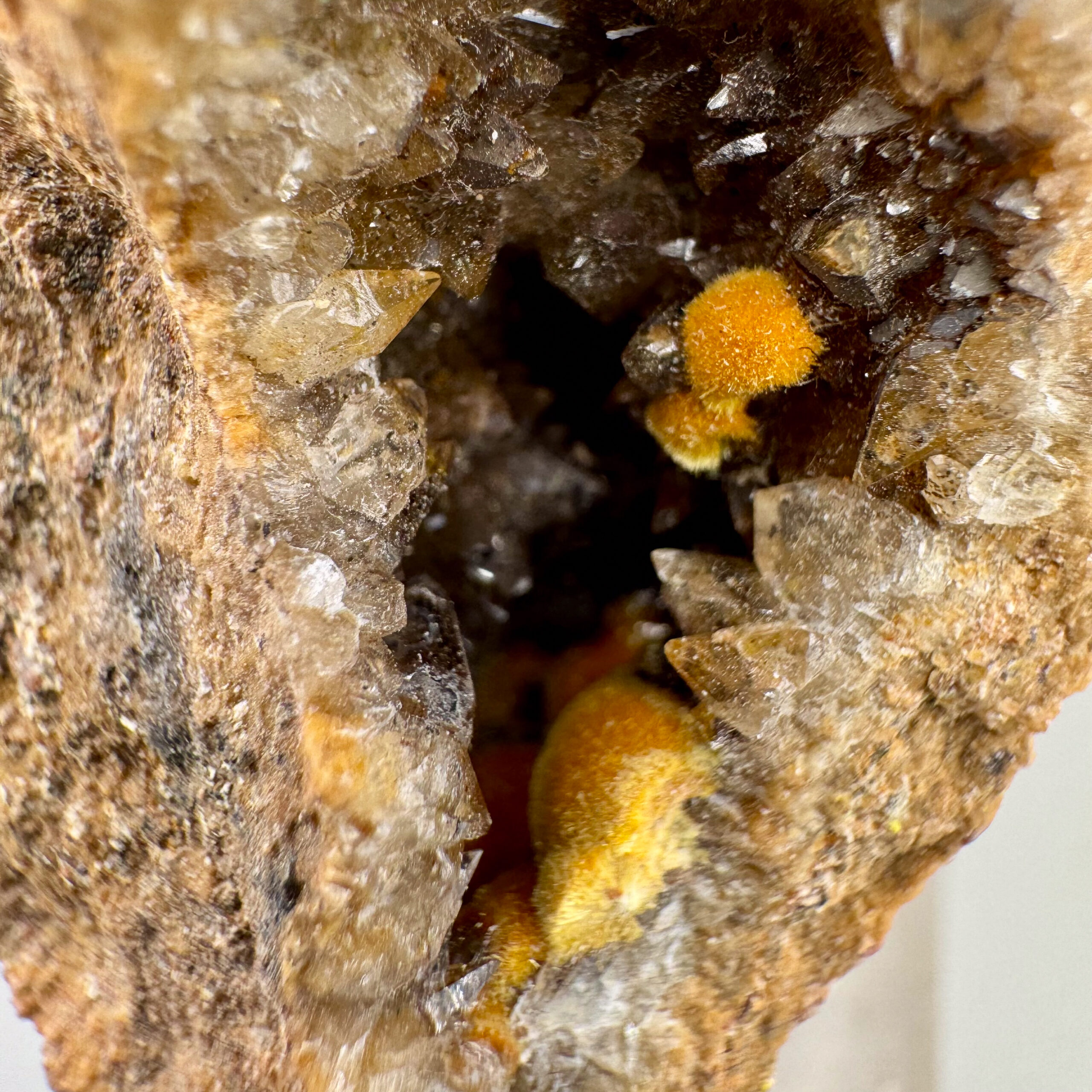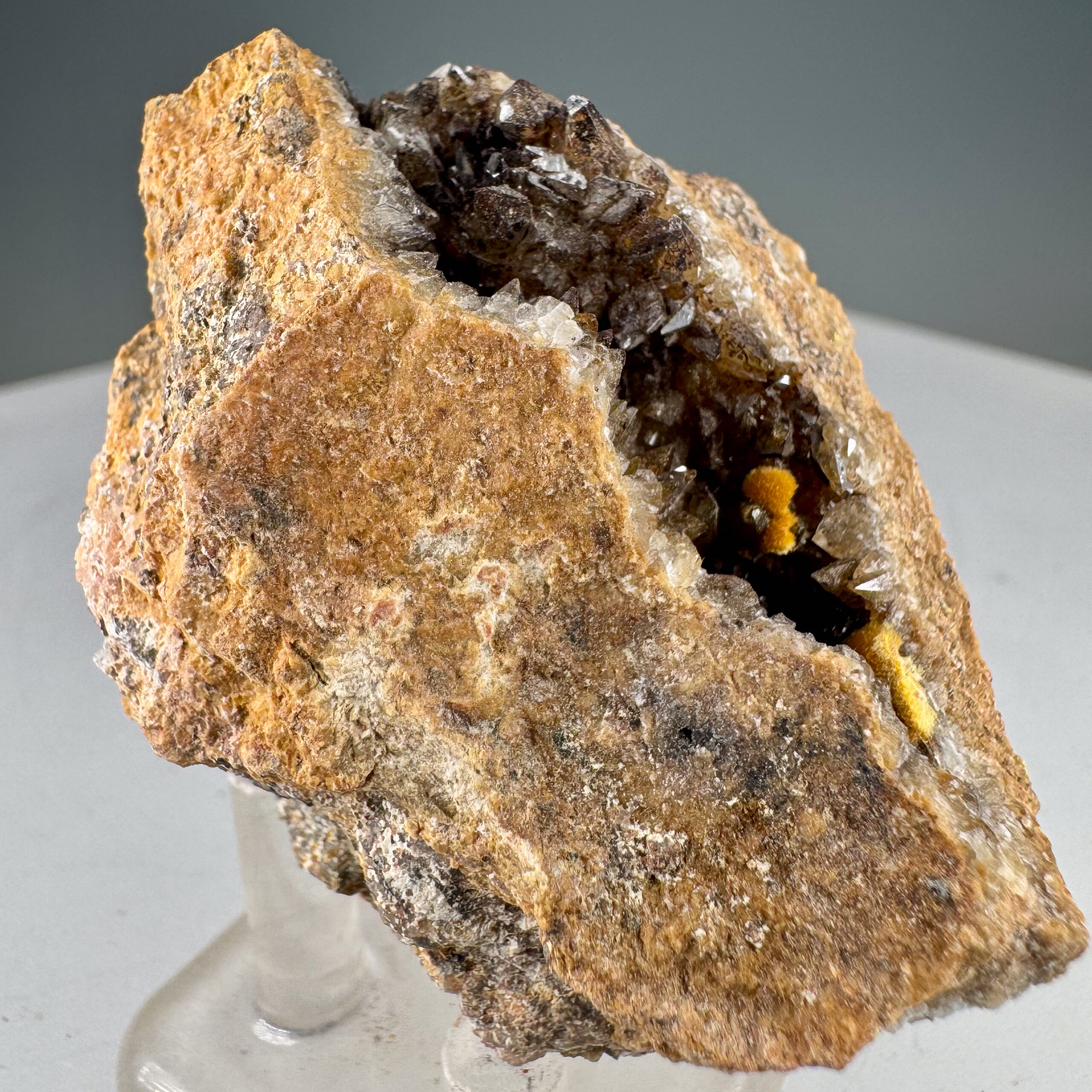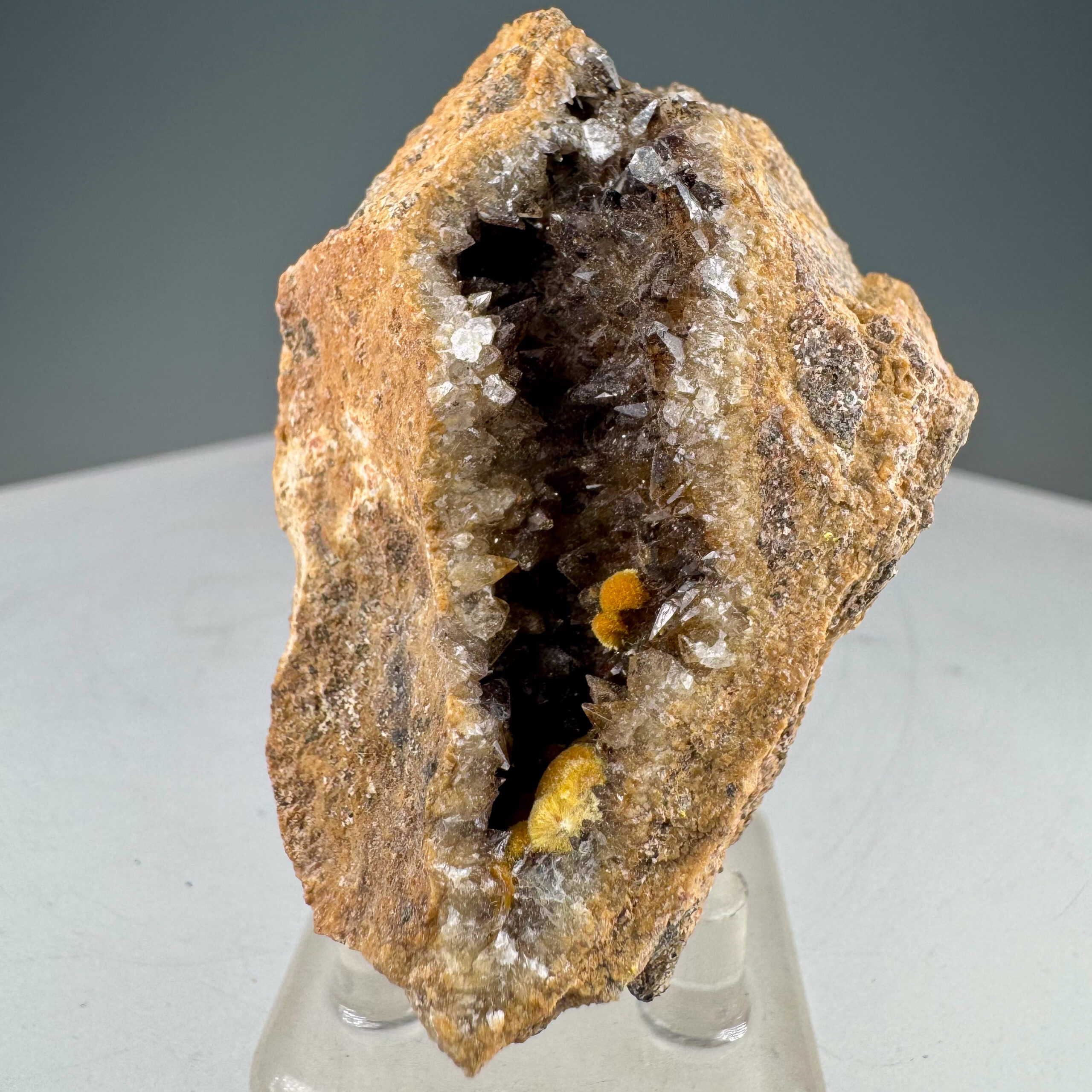Very nice small cabinet-size specimen of nicely-crystallized yellow Boltwoodite from the well-known and classic Goanikontes claim in Namibia. Measures ~10,000 CPM on my Ludlum Model 3 Counter with the 44-9 probe. Rare!