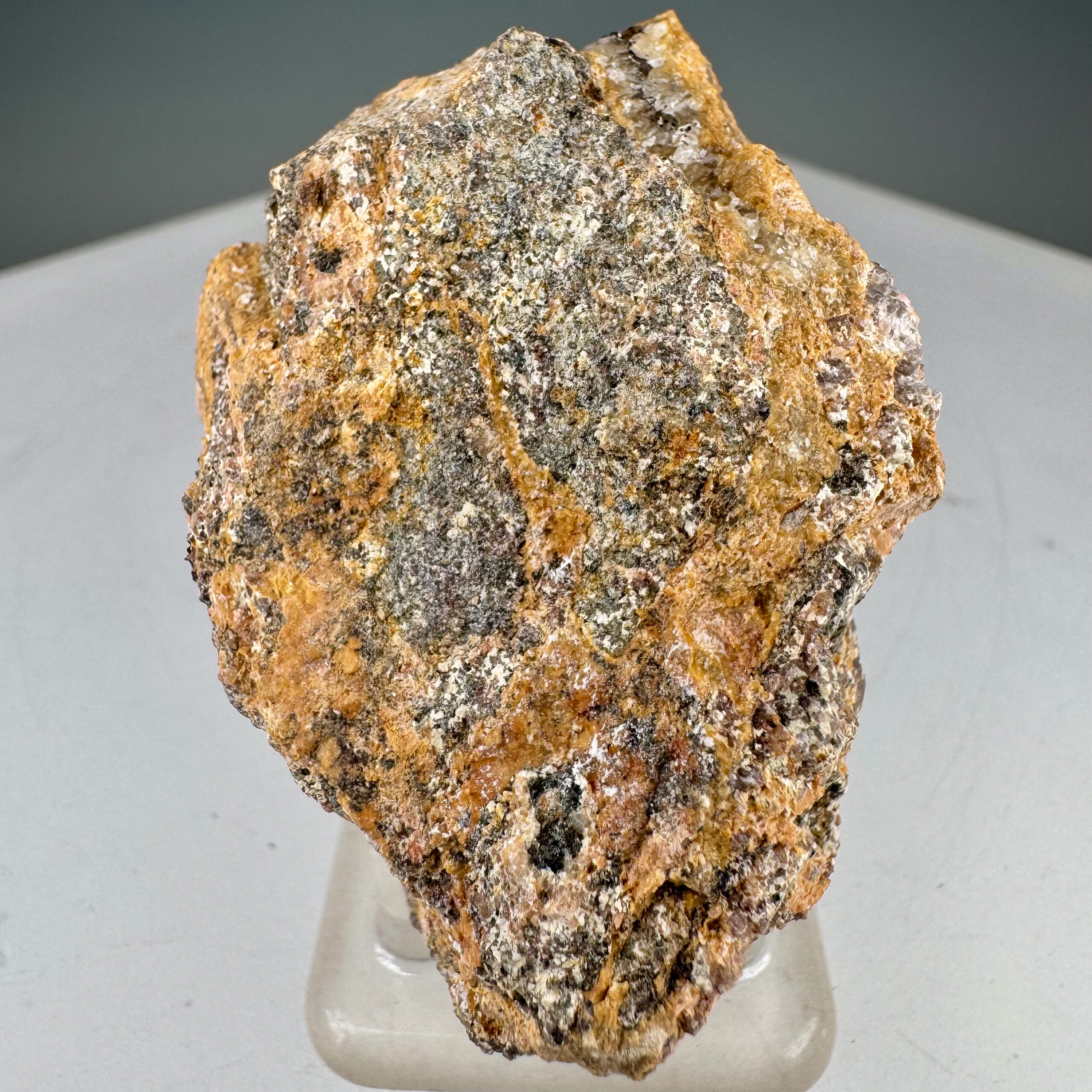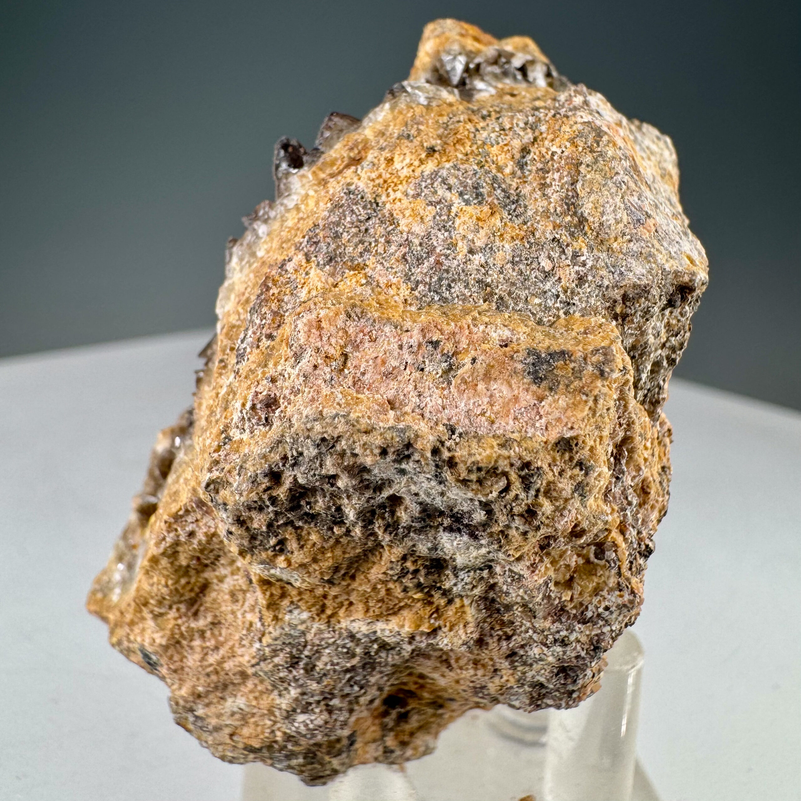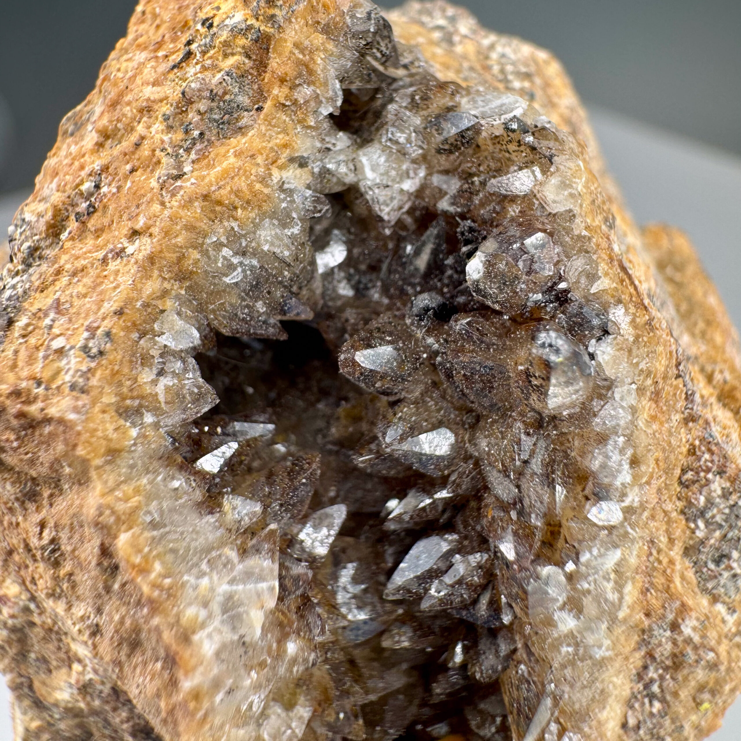 Very nice small cabinet-size specimen of nicely-crystallized yellow Boltwoodite from the well-known and classic Goanikontes claim in Namibia. Measures ~10,000 CPM on my Ludlum Model 3 Counter with the 44-9 probe. Rare!