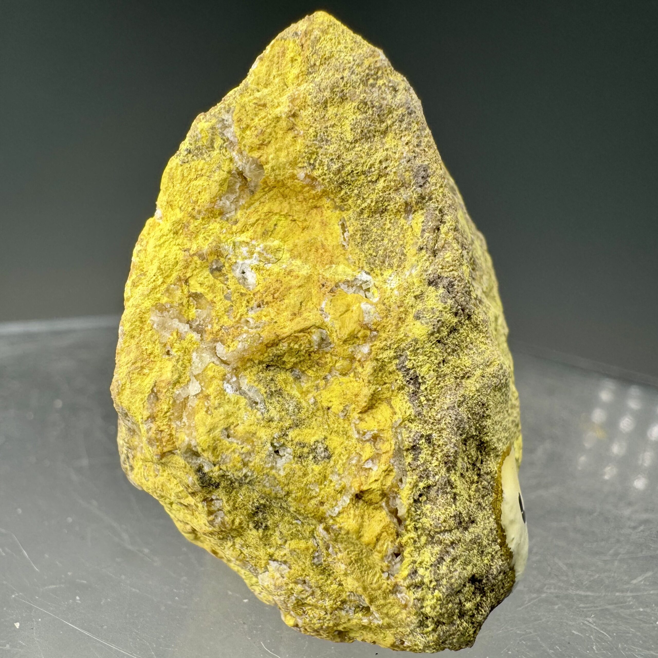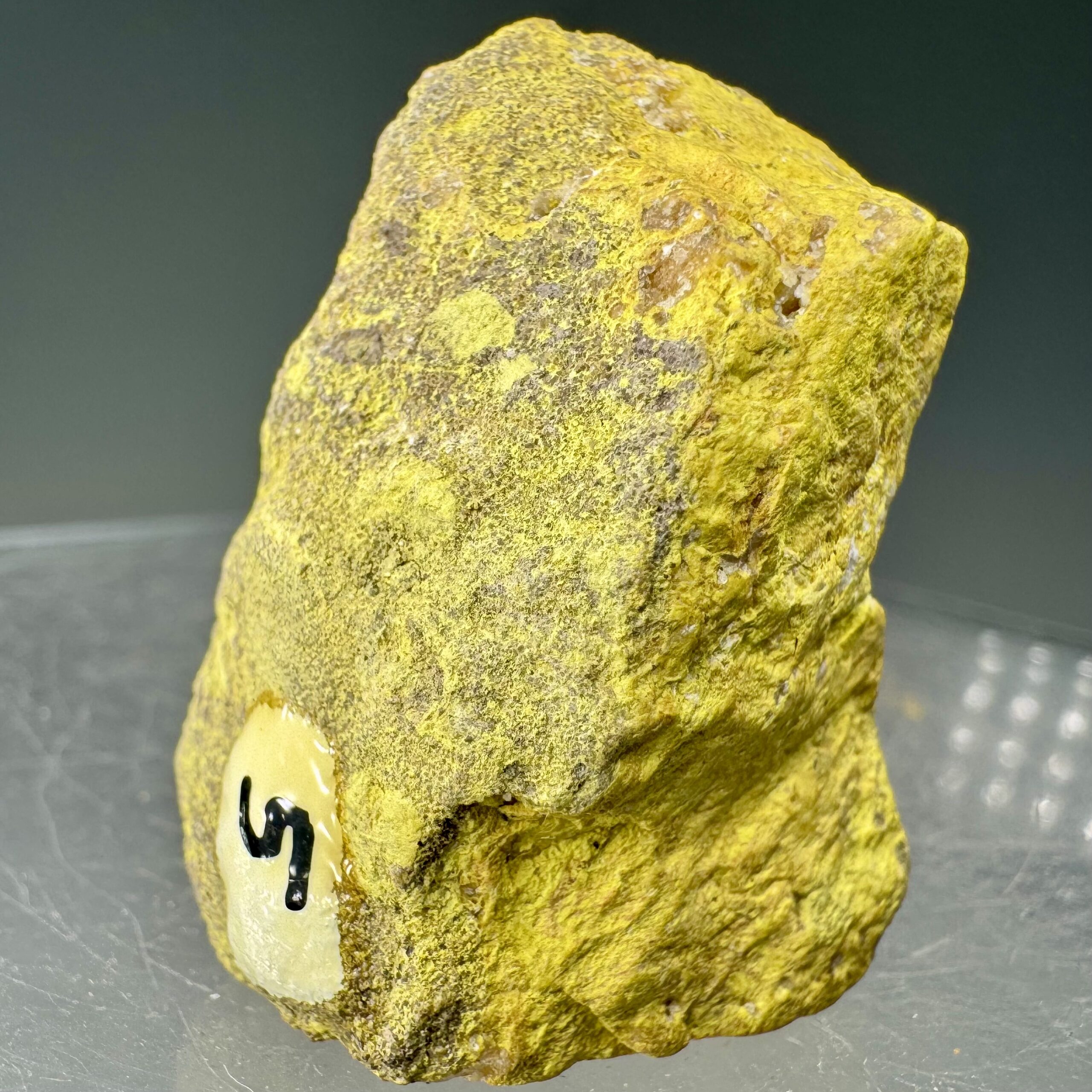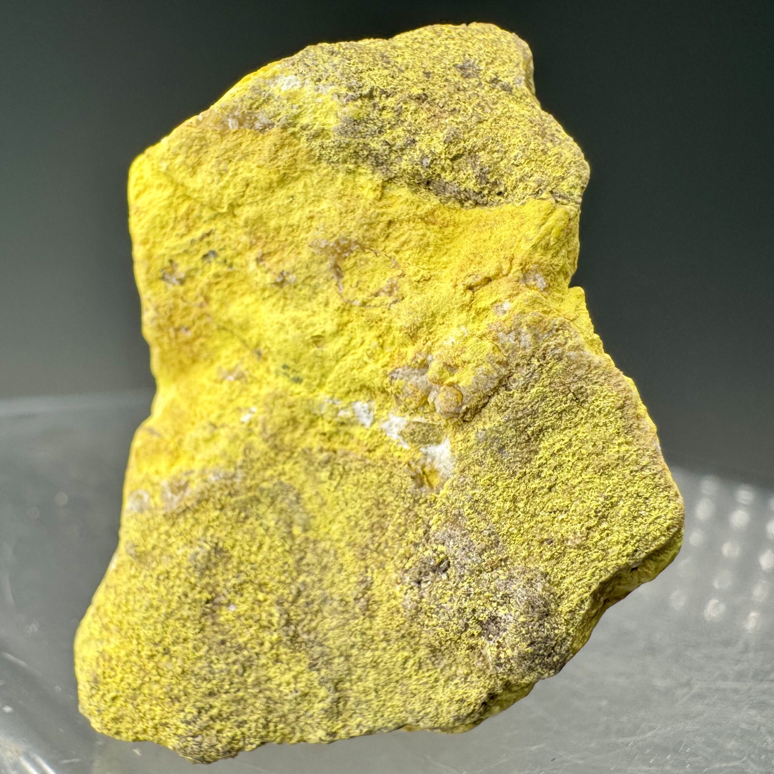 Nice solid specimen of bright-yellow Carnotite: Paradox Valley, Montrose County, Colorado, USA. Measures ~80,000 CPM on my Ludlum Model 3 Counter with the 44-9 “pancake” probe. Rare!