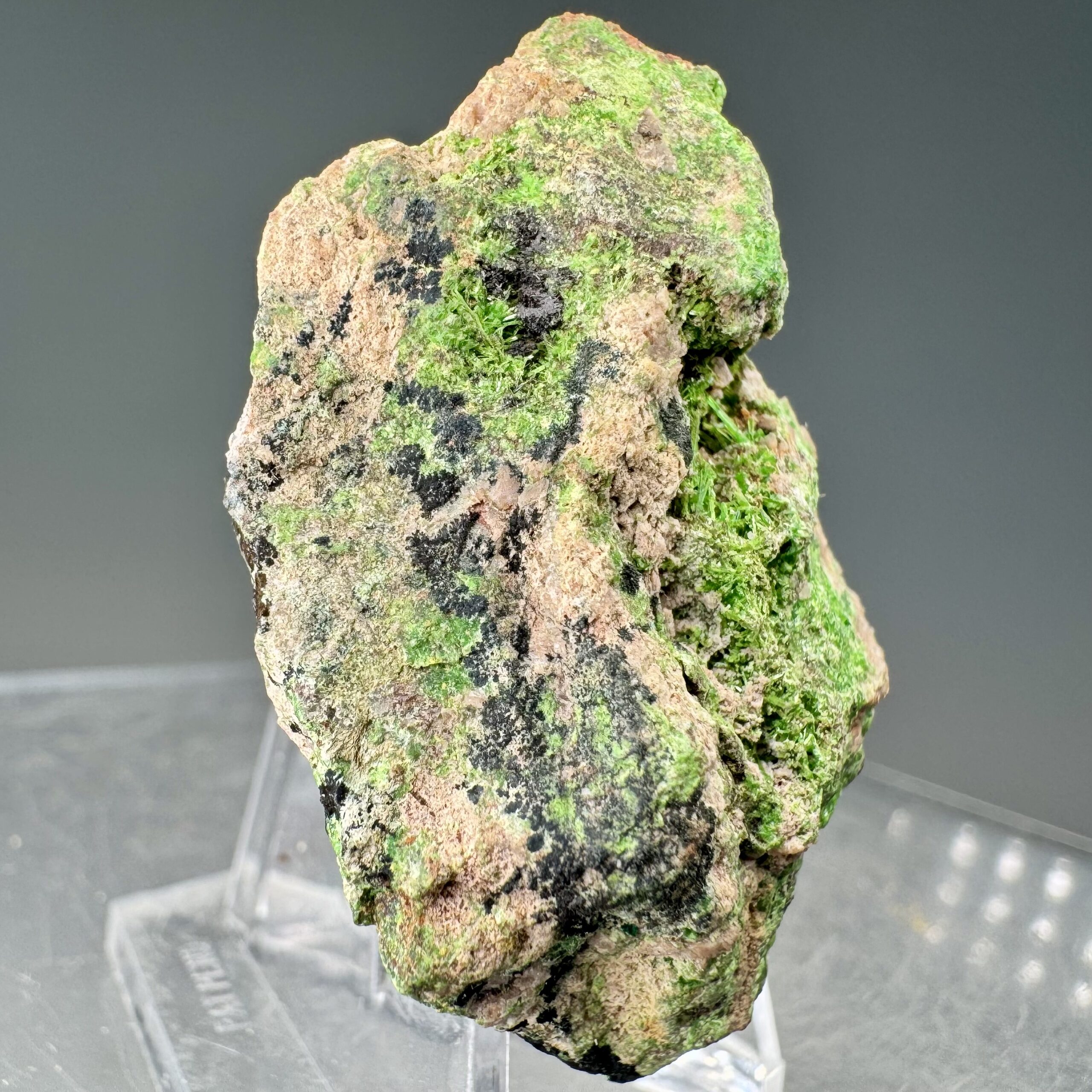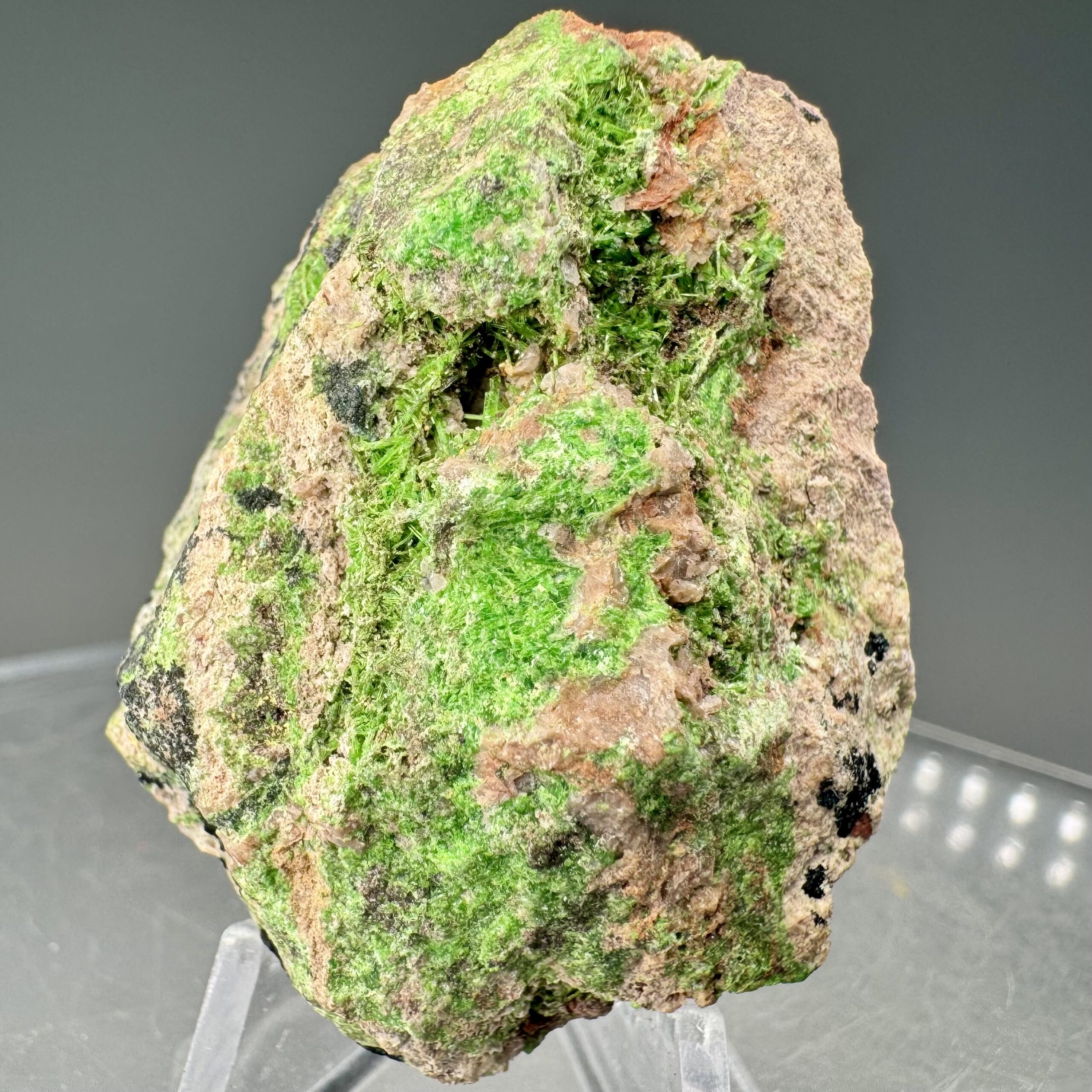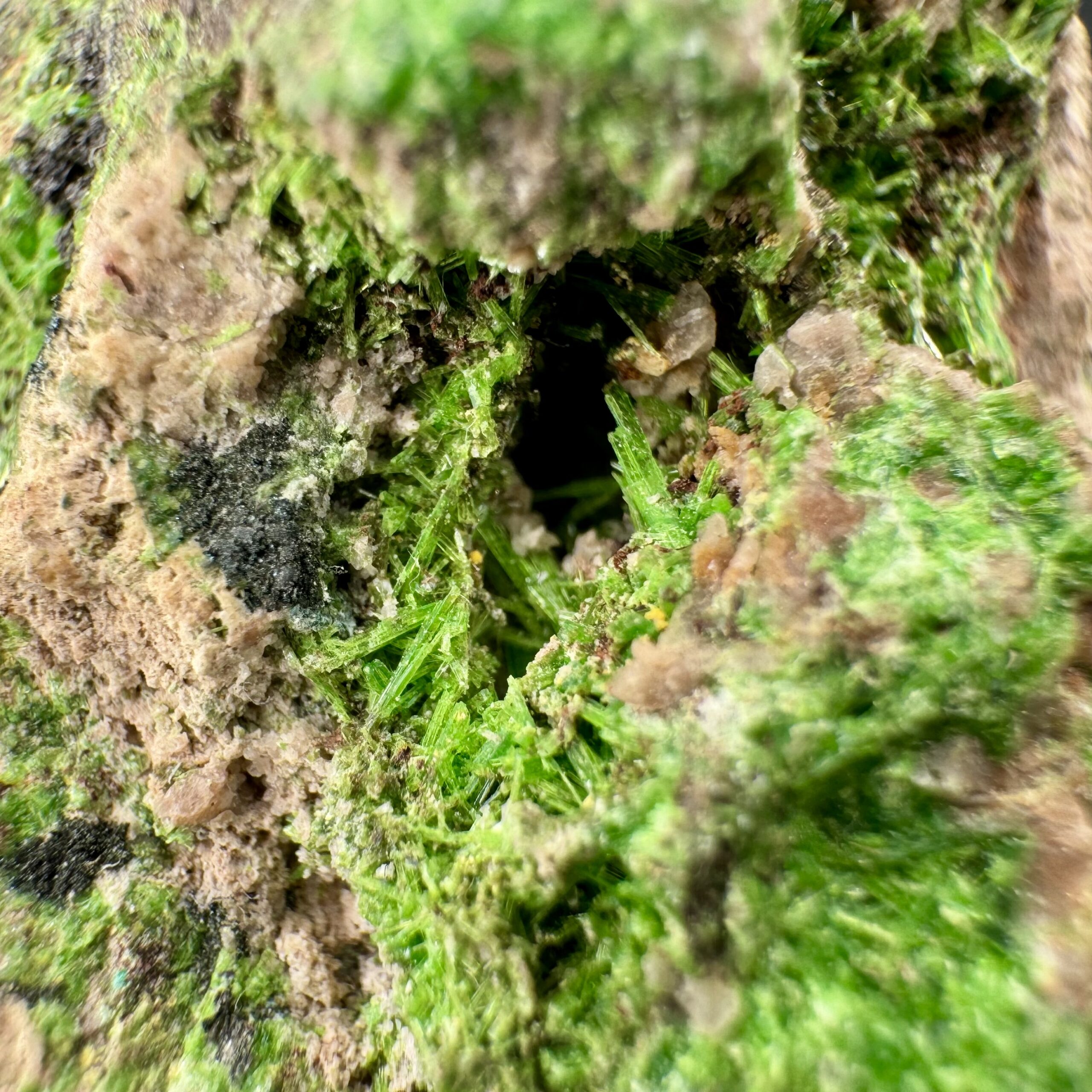 Fine specimen of needle-like bright green Cuprosklodowskite crystals on matrix from the Musonoi Mine, Kolwezi, Mutshatsha, Lualaba, DR Congo. Measures ~150,000 CPM on my Ludlum Model 3 Counter with the 44-9 “pancake” probe. Rare!