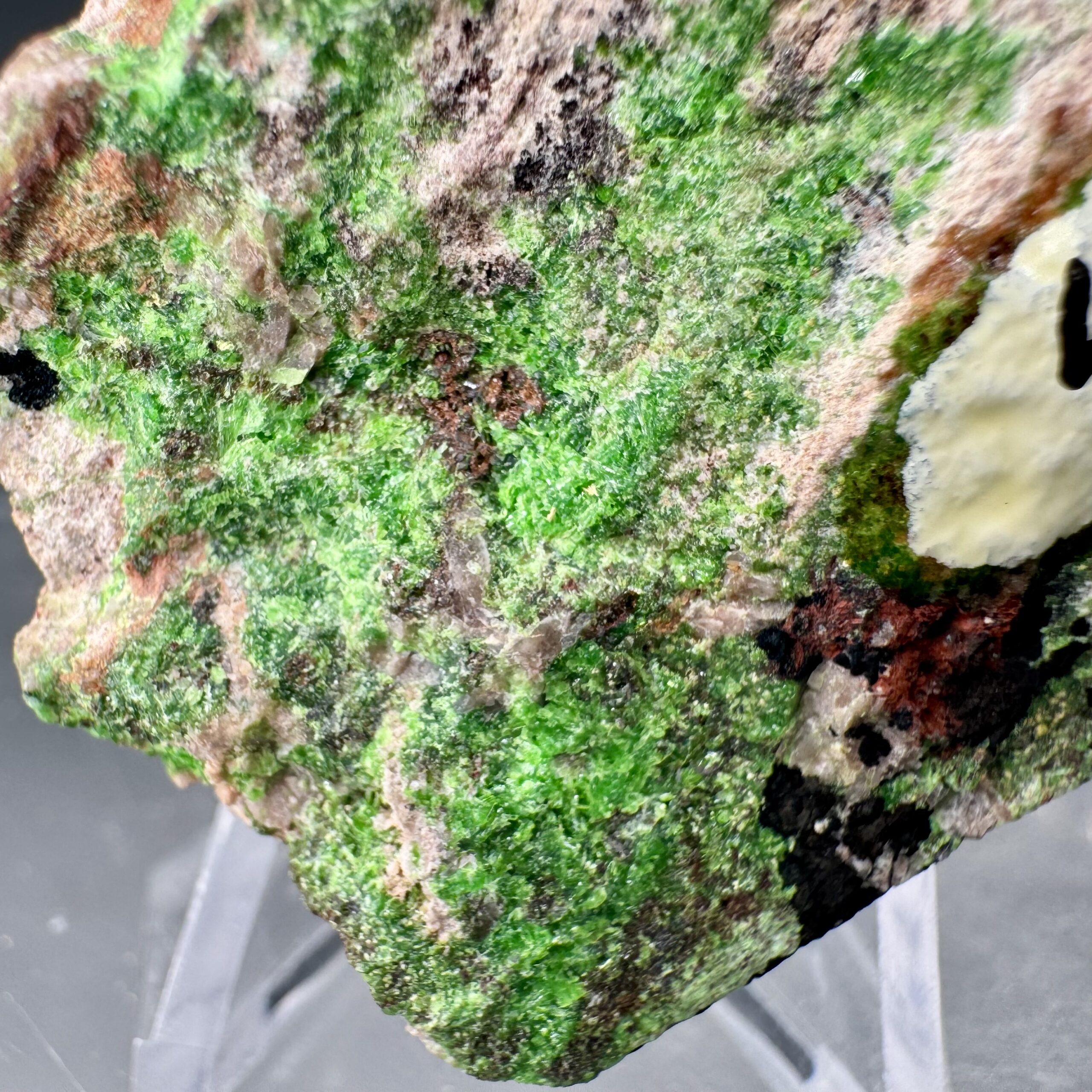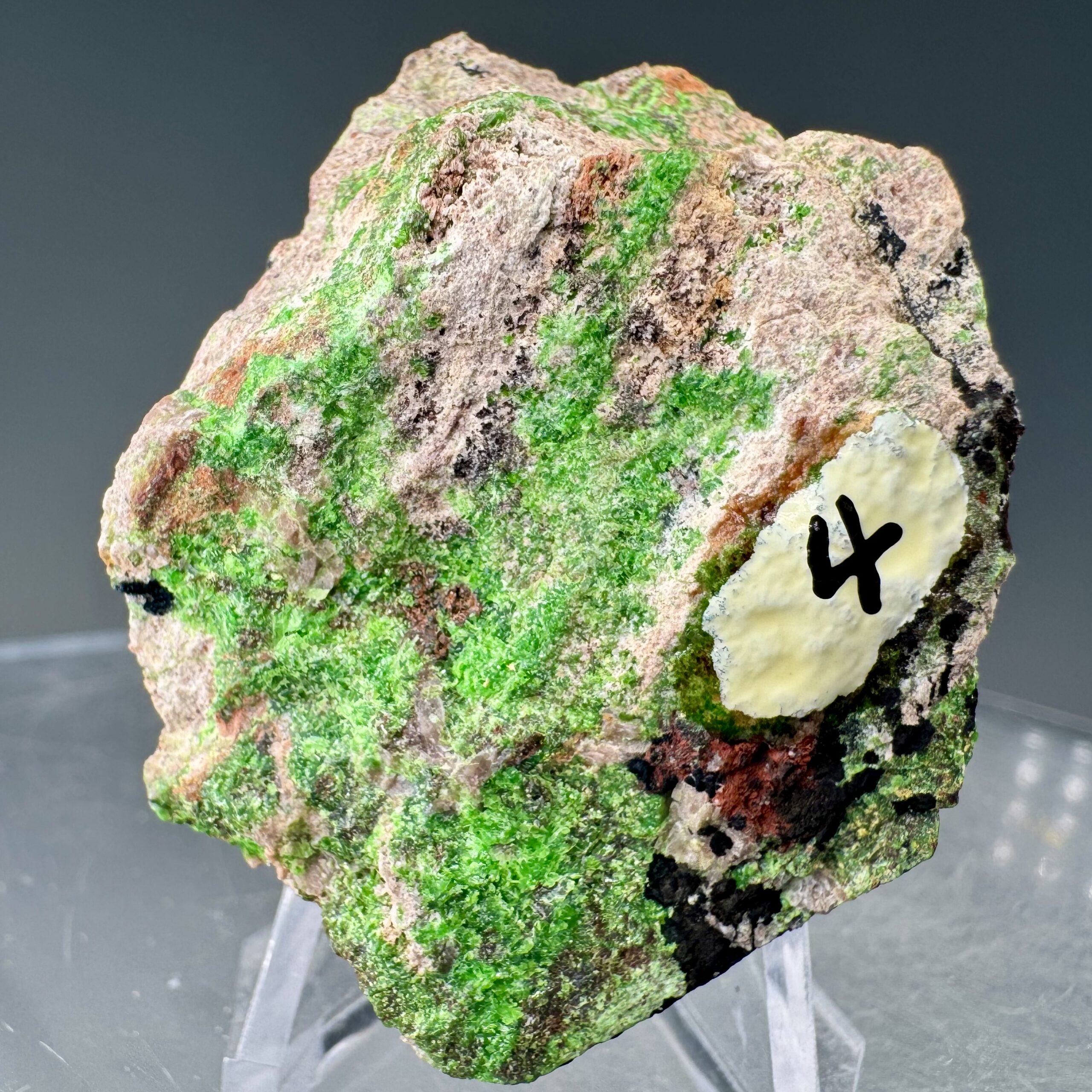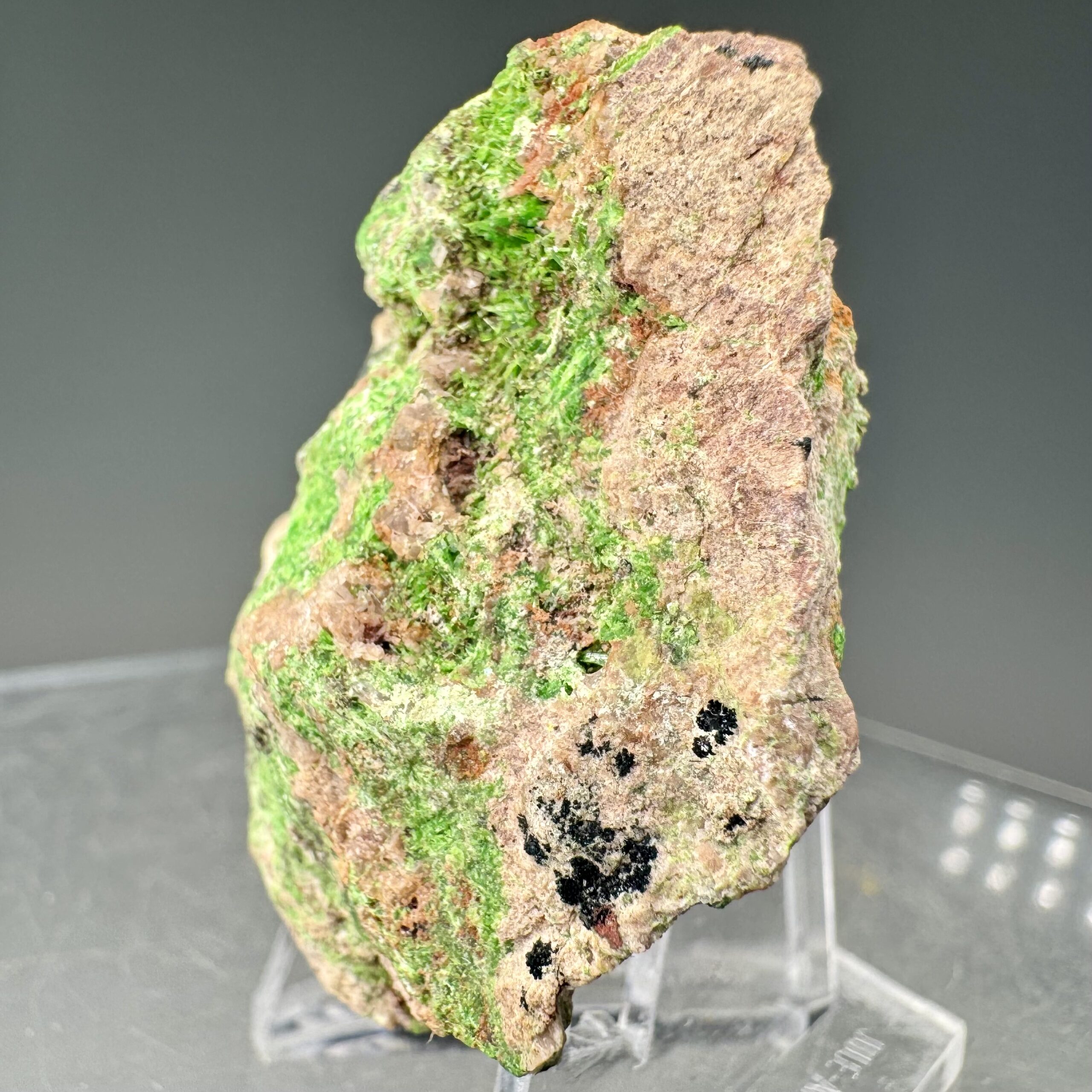Fine specimen of needle-like bright green Cuprosklodowskite crystals on matrix from the Musonoi Mine, Kolwezi, Mutshatsha, Lualaba, DR Congo. Measures ~150,000 CPM on my Ludlum Model 3 Counter with the 44-9 “pancake” probe. Rare!