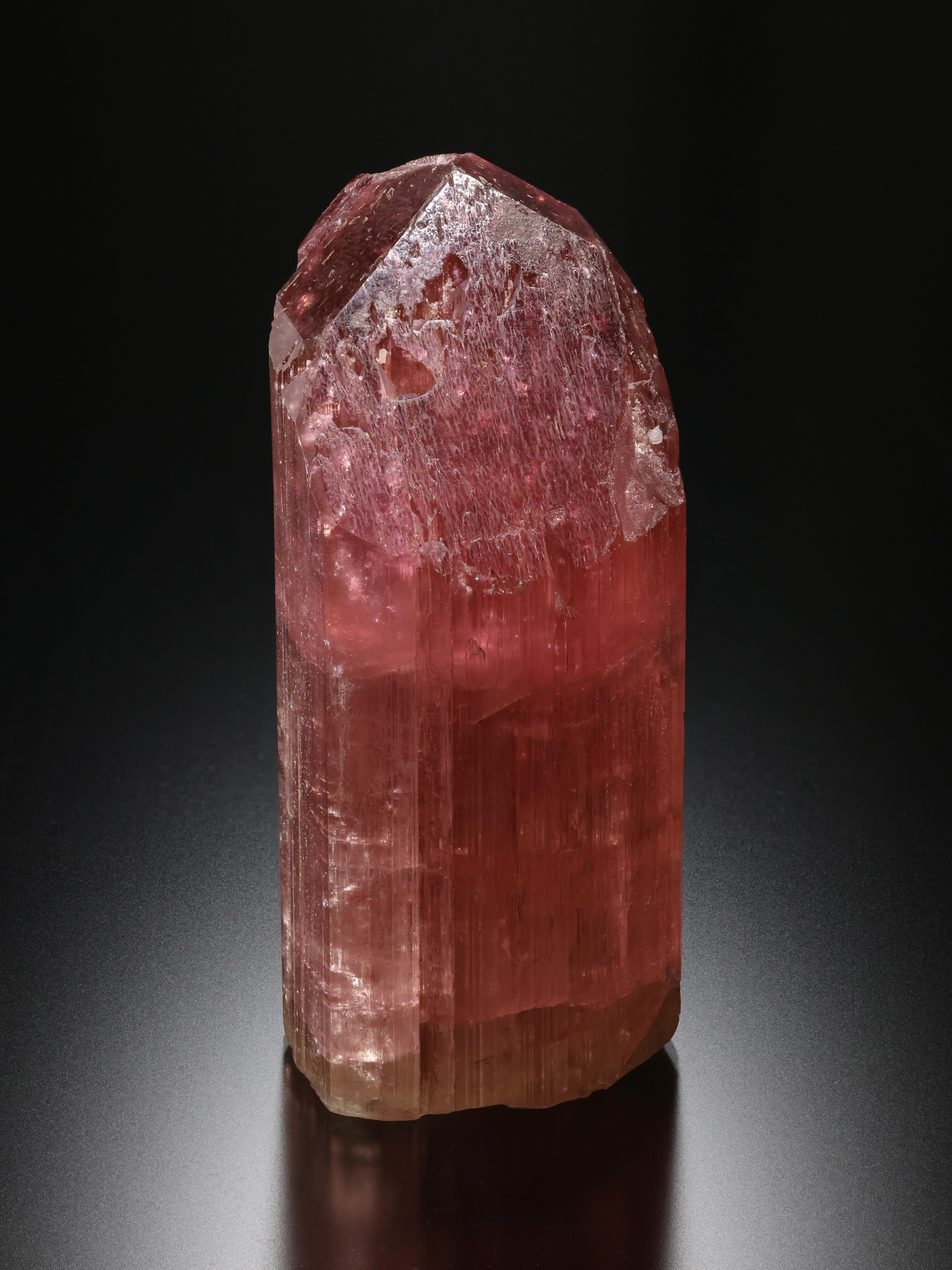 Beautiful doubly-terminated large gem Elbaite Tourmaline crystal with very nice pink color from the famous Himalaya mine in southern California. Ex. Charlie Ruggles collection. Mark Cross photo. Classic!!