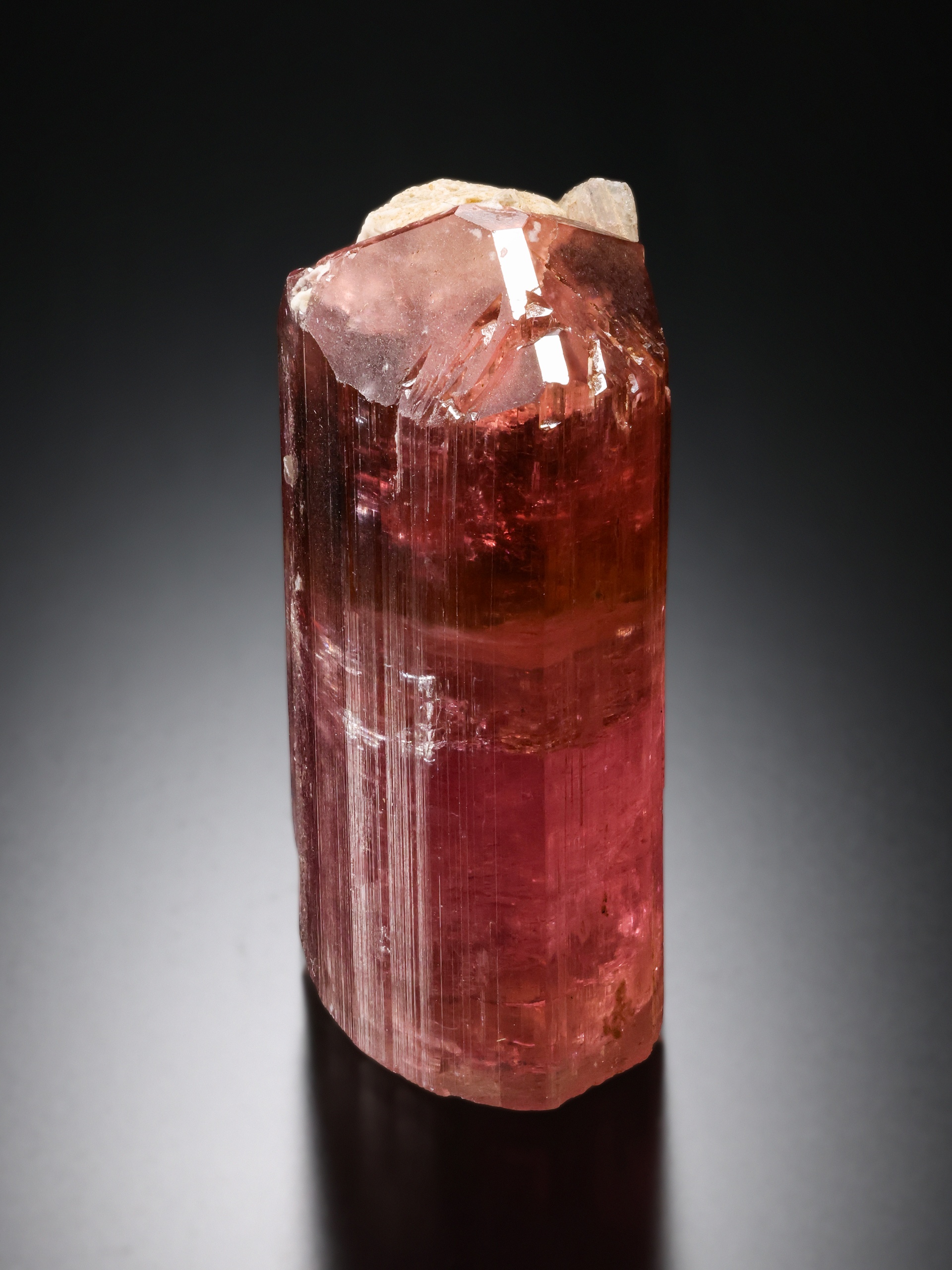 Beautiful doubly-terminated hot pink gem Elbaite Tourmaline crystal with very nice pink color from the famous Stewart mine in southern California. Ex. Charlie Ruggles and George Witters collections. Good Stewart mine tourmaline crystals are not easy to find! Comes with a custom acrylic display base. Mark Cross photo. Classic!