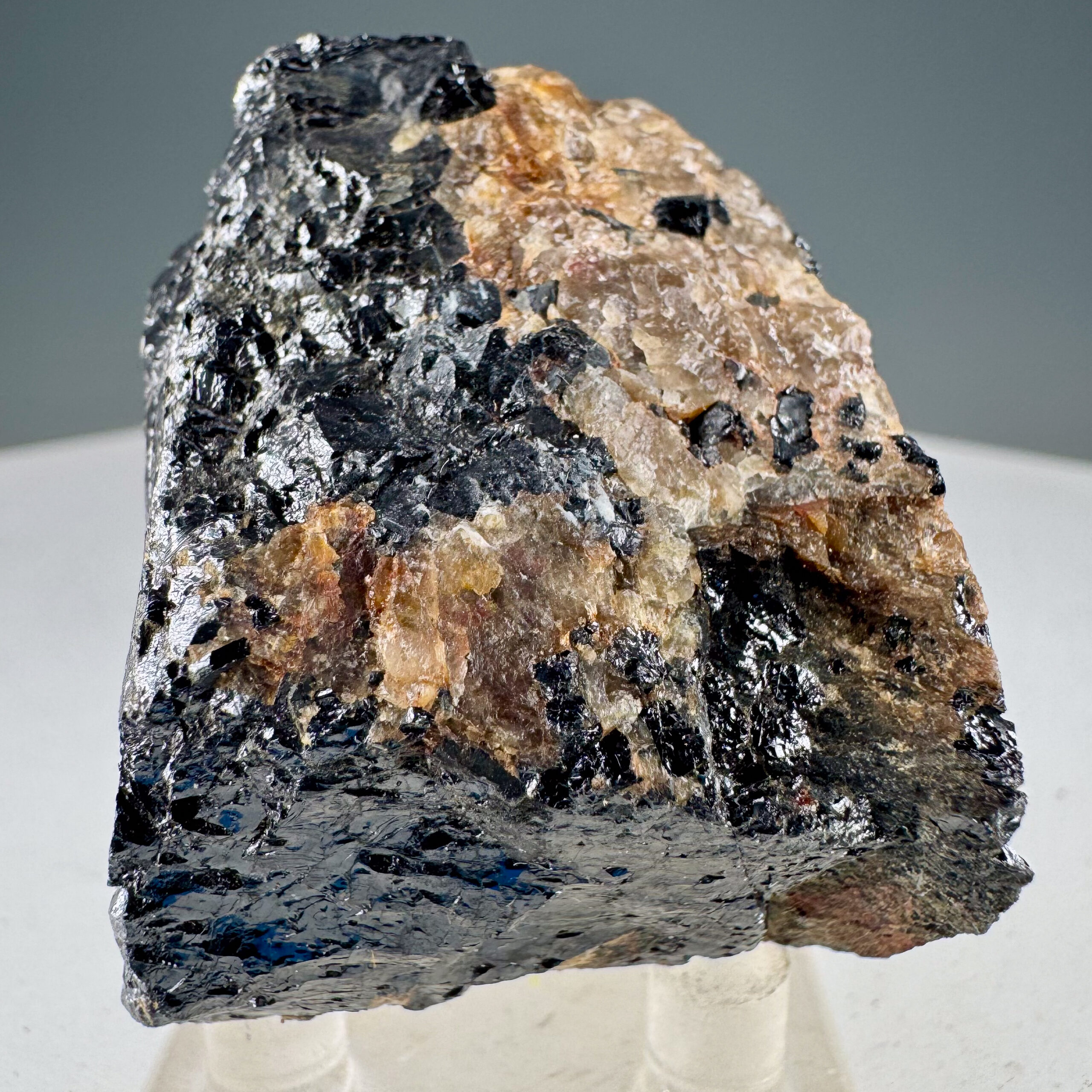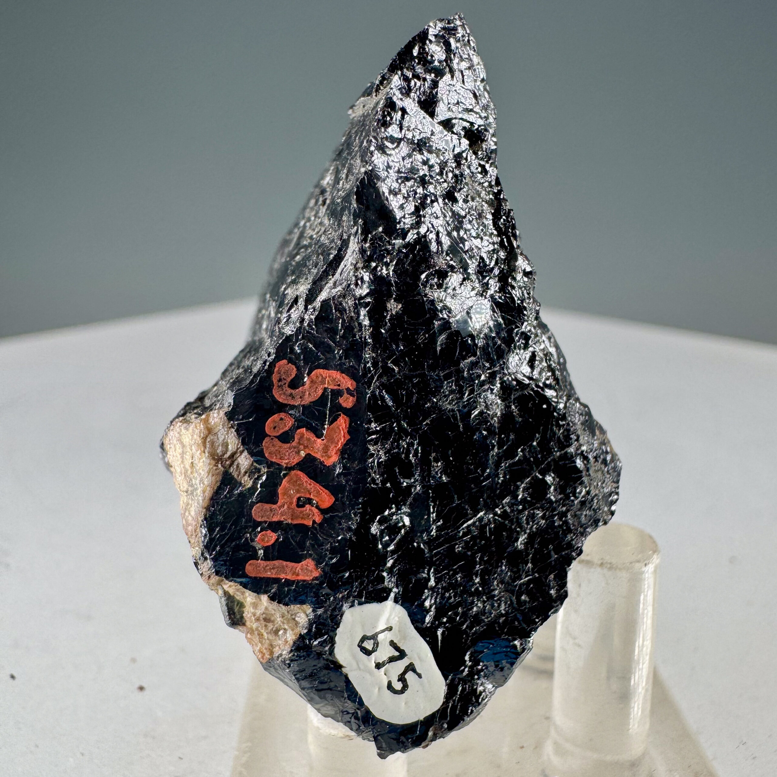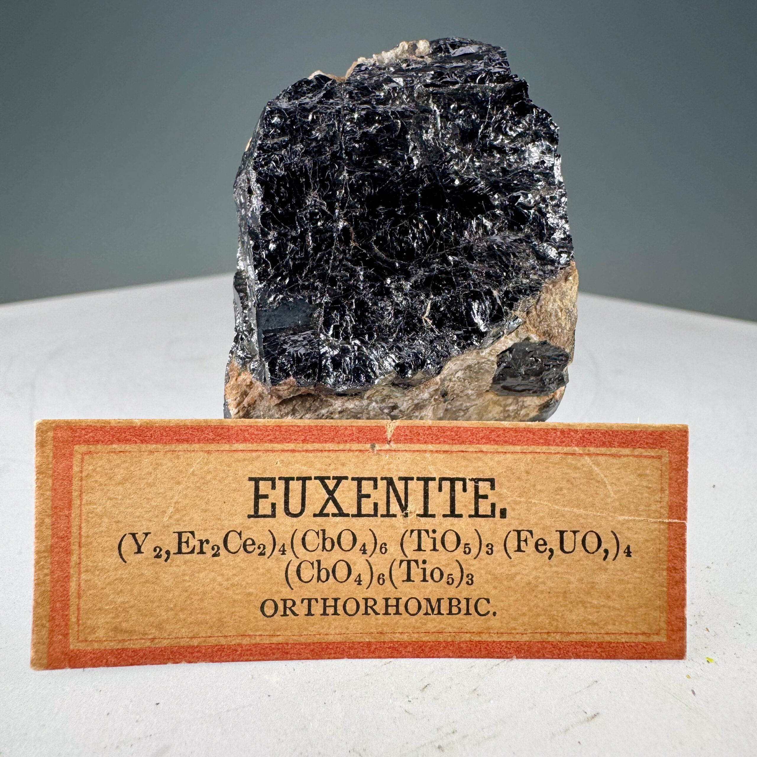 Nice large solid specimen of waxy black Euxenite-(Y) from Norway with a neat antique label. Measures ~35,000 CPM on my Ludlum Model 3 Counter with the 44-9 probe. Rare!