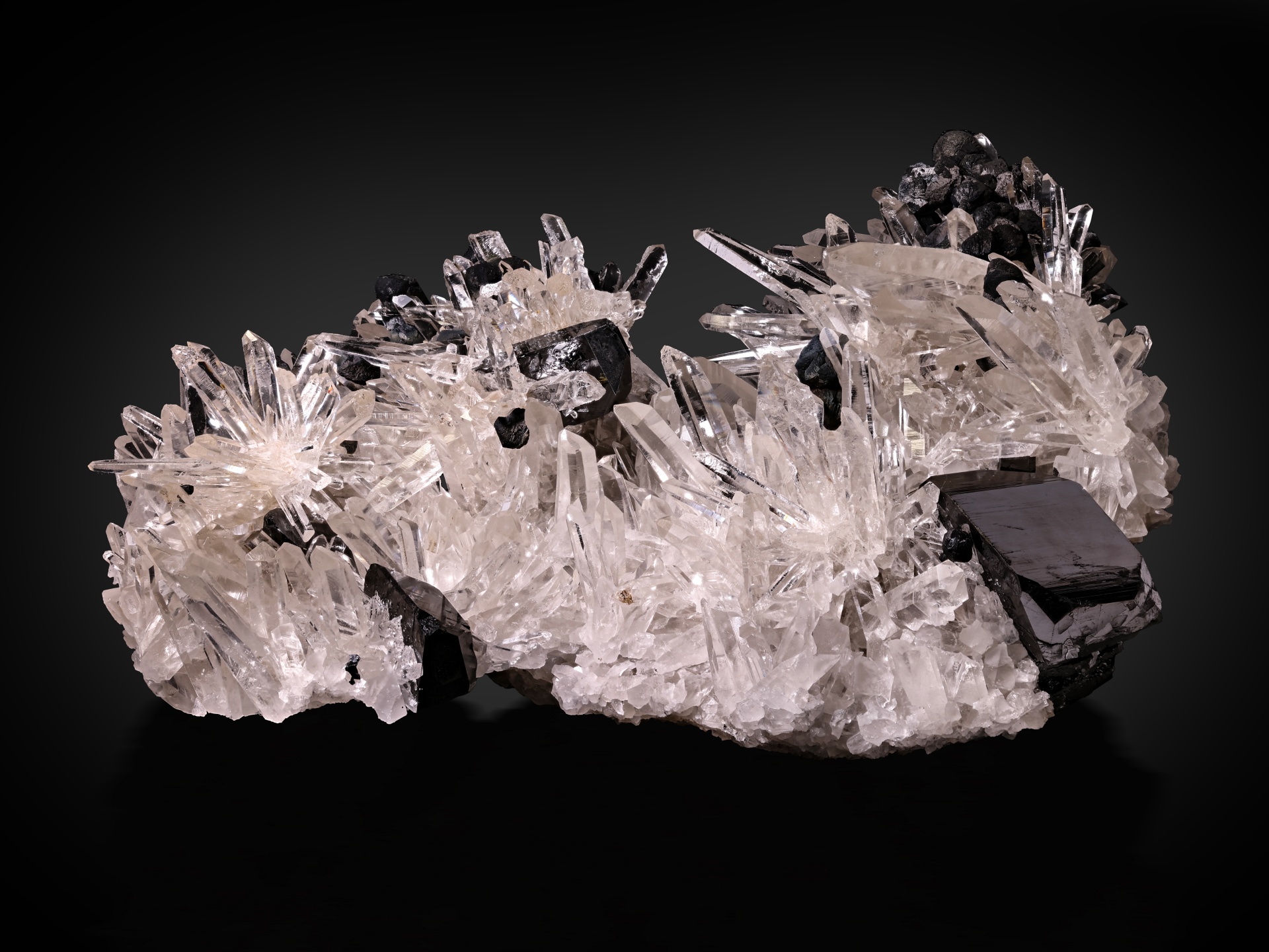 Outstanding, large, highly-aesthetic specimen featuring large, razor-sharp, highly-lustrous black Ferberite crystals (some twinned) arranged across a 3-dimensional matrix of gemmy undamaged clear quartz crystals, from the Kami Mine in Ayopaya Province, Cochabamba, Bolivia. For the species (ferberite) the quality is very very high with this piece. Mark Cross photo.