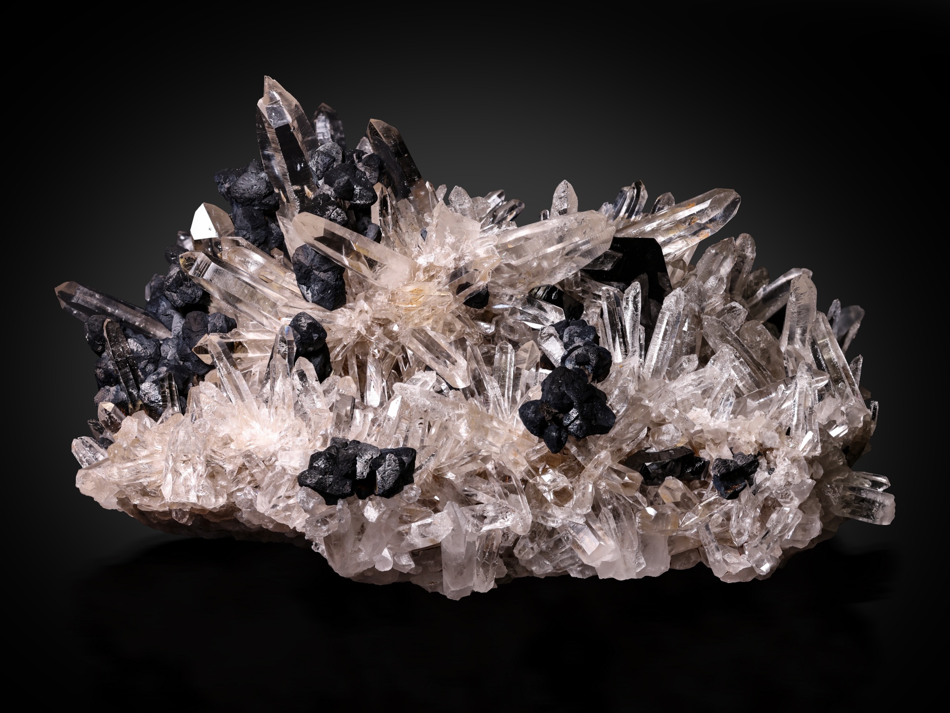 Outstanding, large, highly-aesthetic specimen featuring large, razor-sharp, highly-lustrous black Ferberite crystals  arranged across a 3-dimensional matrix of gemmy undamaged clear quartz crystals with well-formed black sphalerite crystals, from the Kami Mine in Ayopaya Province, Cochabamba, Bolivia. For the species (ferberite) the quality is very high with this piece. Mark Cross photo.