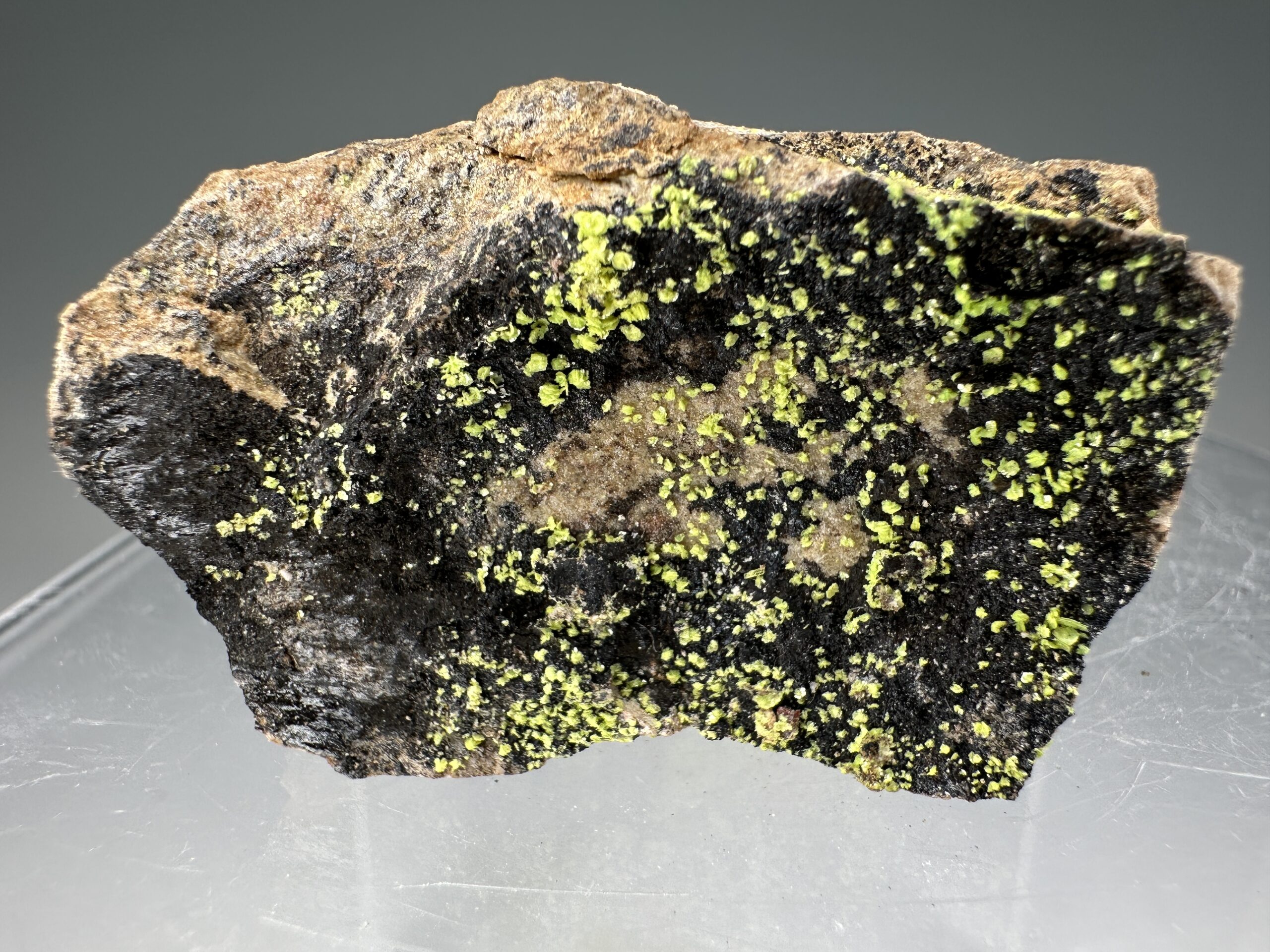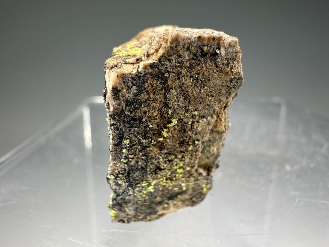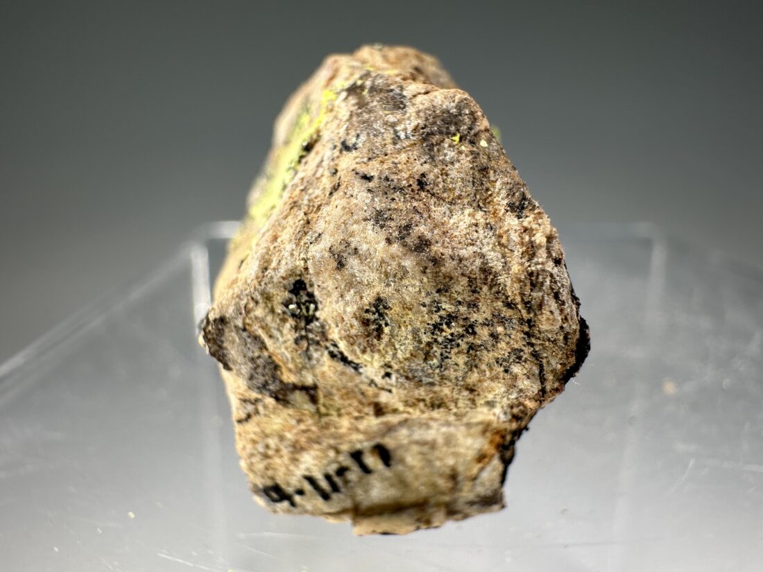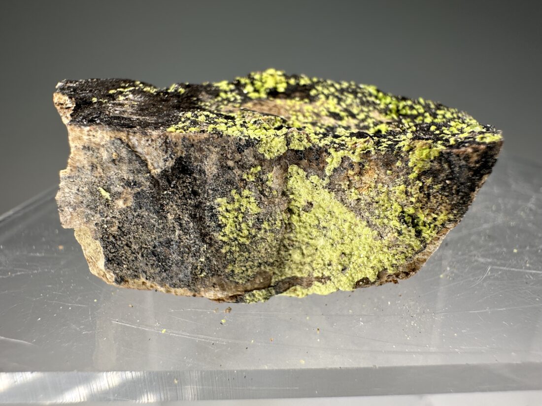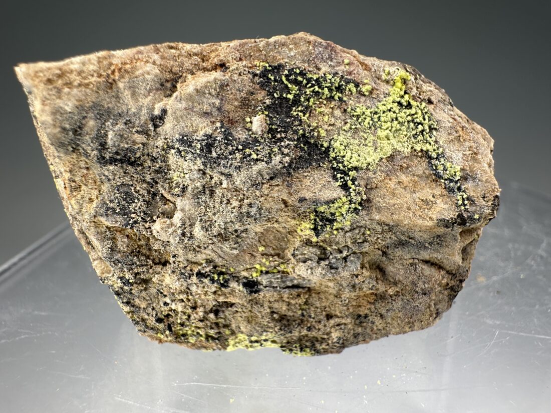 Rare specimen of bright yellow-green Liebigite from the Midnite Mine, Pend Oreille County, Washington, USA. Brilliant yellow fluorescence under U.V. light!