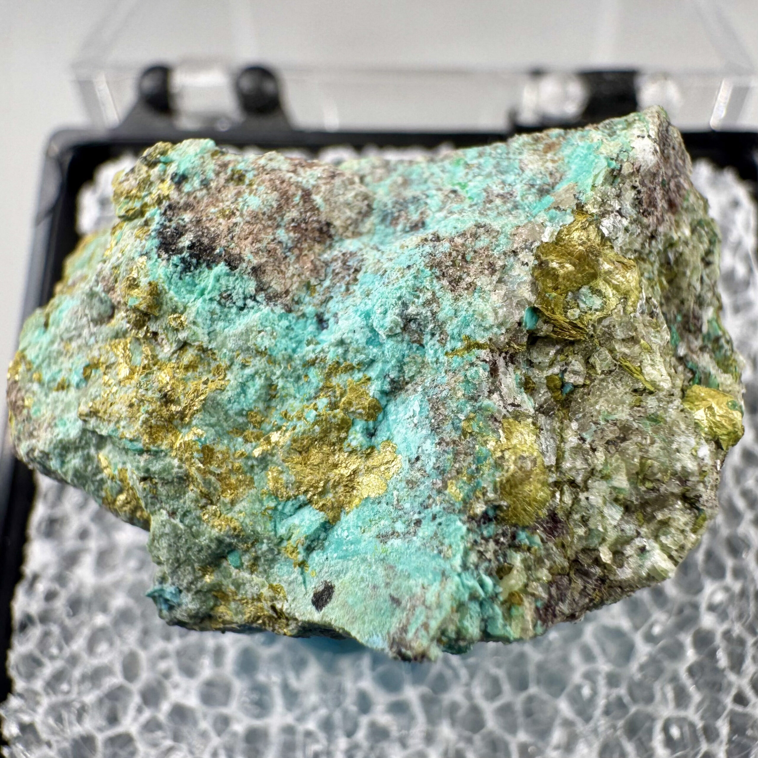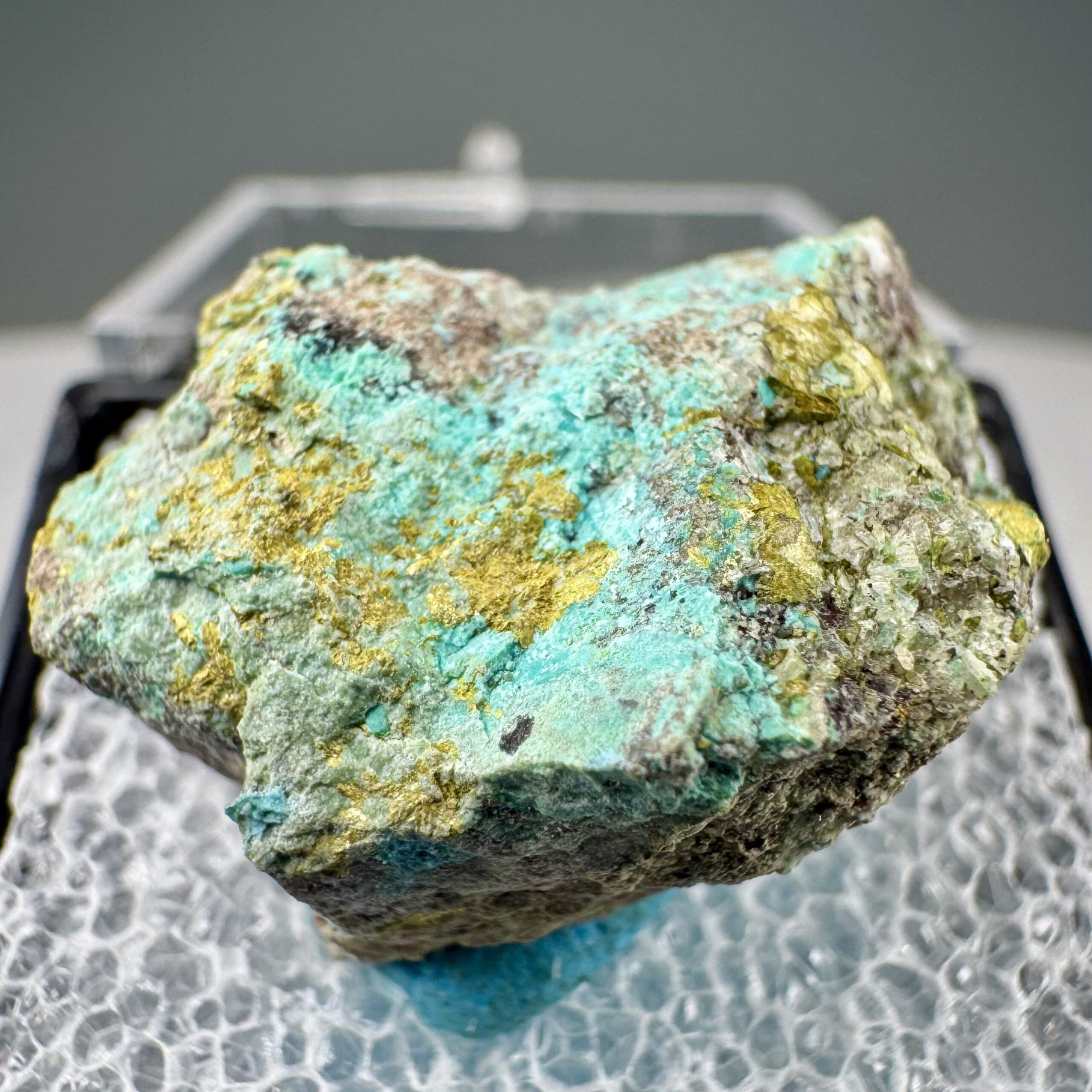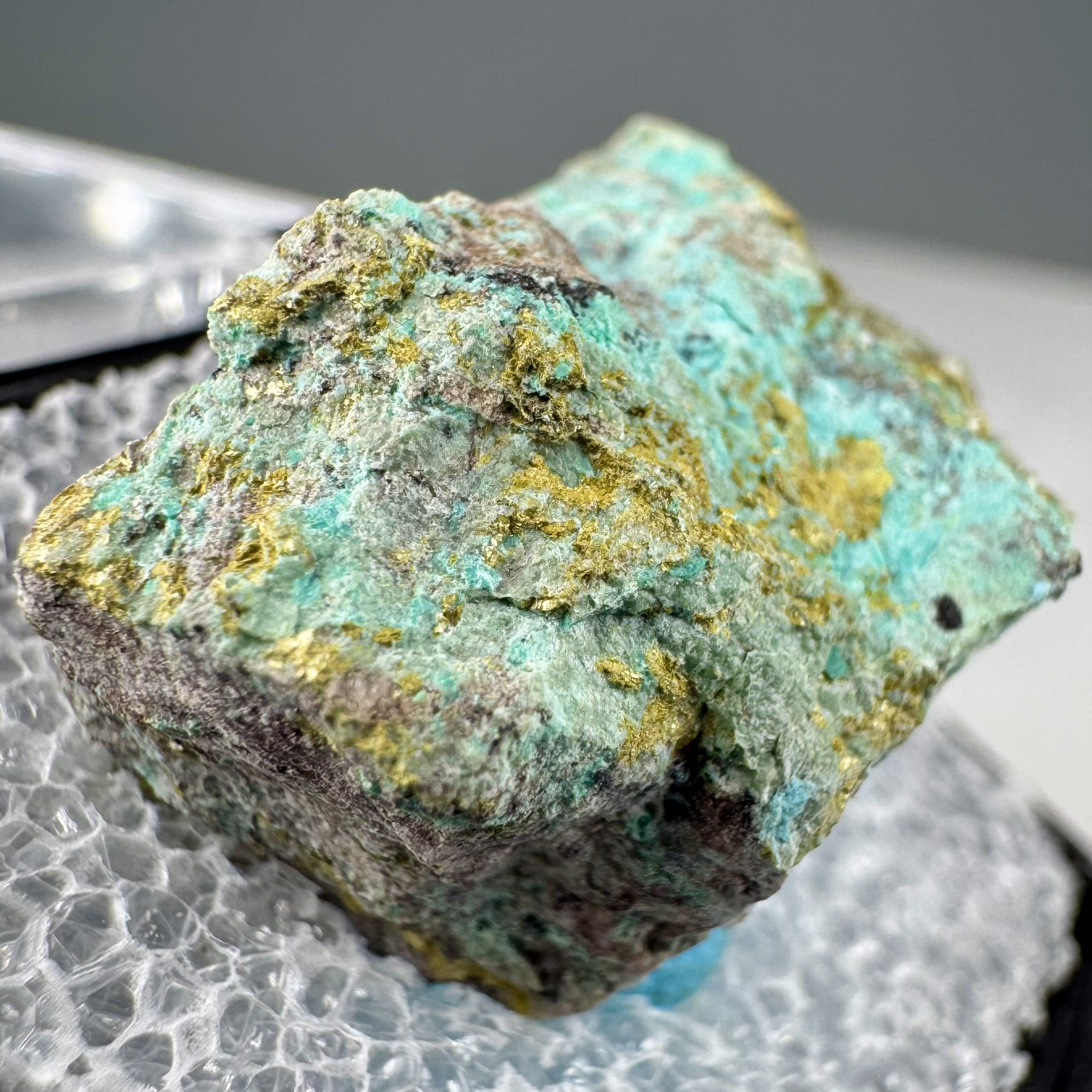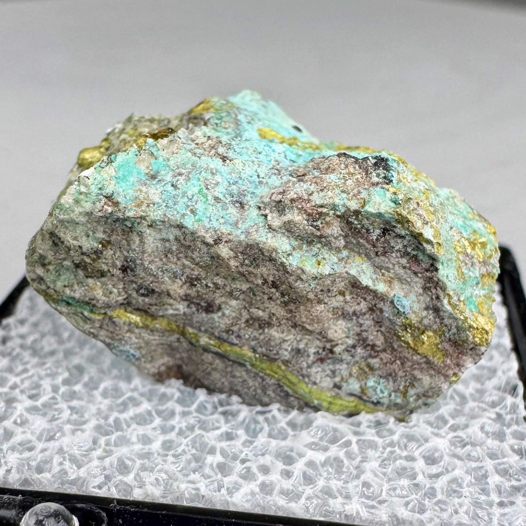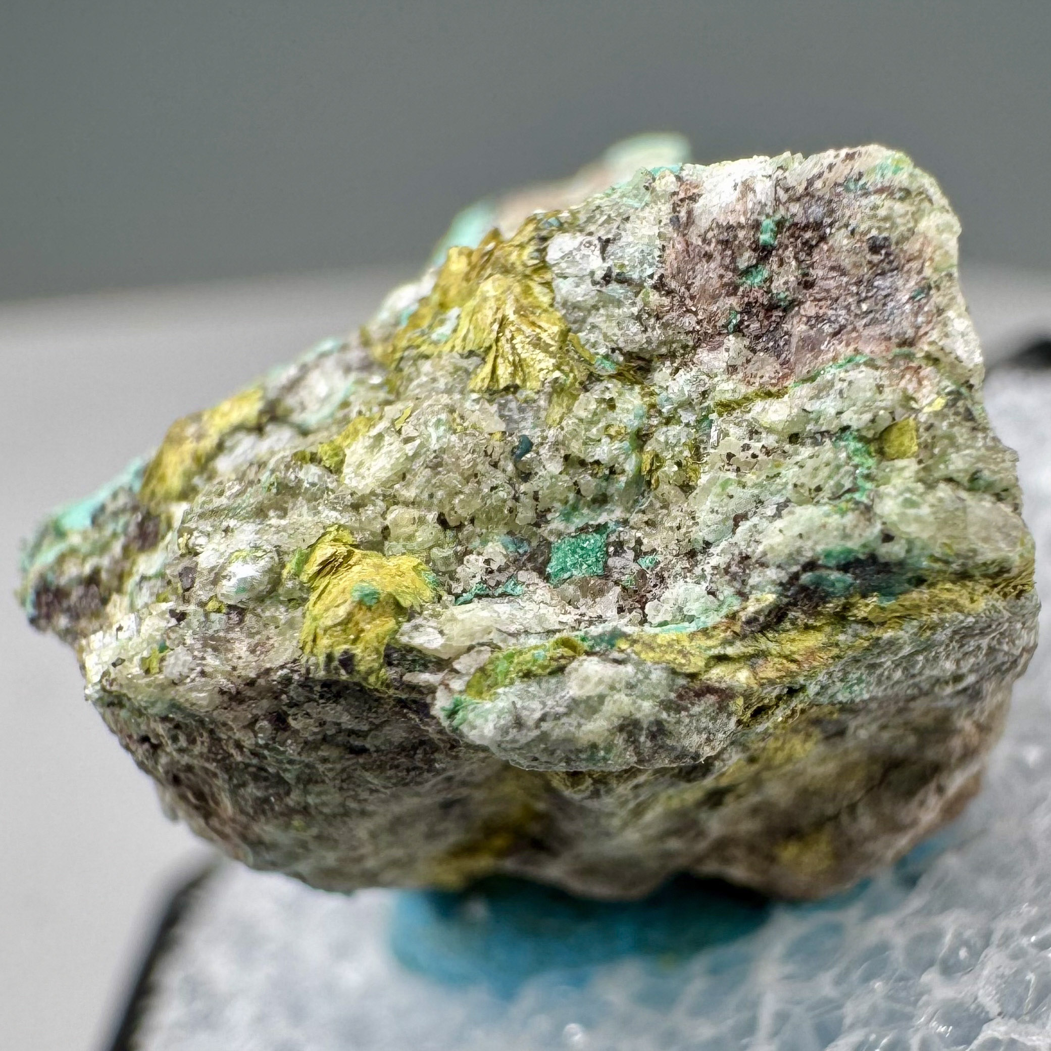 Nice small inexpensive specimen of lime-green Marthozite on pale-blue Chalcomenite from the famous Musonoi Mine, Kolwezi, Mutshatsha, Lualaba, DR Congo. Rare and sought-after material!