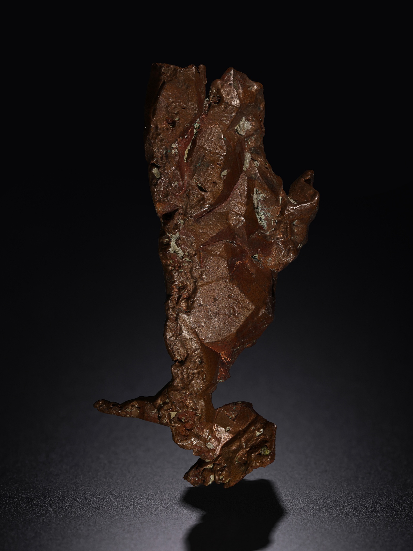 Excellent group of sharp, well-formed copper crystals with a perfect patina showing well-developed tetrahexahedral form, from the famous Central mine in northern Michigan’s Keweenaw Peninsula. Comes with a custom acrylic display base. Mark Cross photo. Classic!!