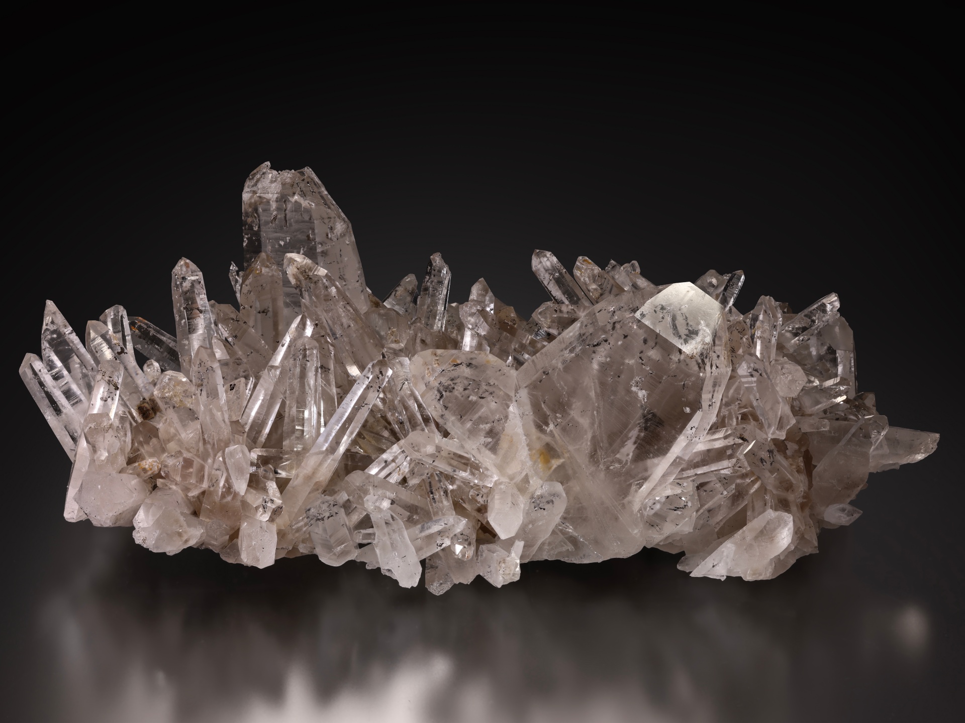 Superb large plate of sharp, transparent quartz crystals in which two large, undamaged Japan-law twins rest of a matrix of typical prismatic quartz crystals. Many of the quartz crystals have unusual inclusions of silvery arsenopyrite, and small black sphalerite crystals studded about this large piece add great contrast. A superb quartz specimen from the Kami mine in Bolivia, a noted worldwide locality for Japan-law twinned quartz. Mark Cross photo.