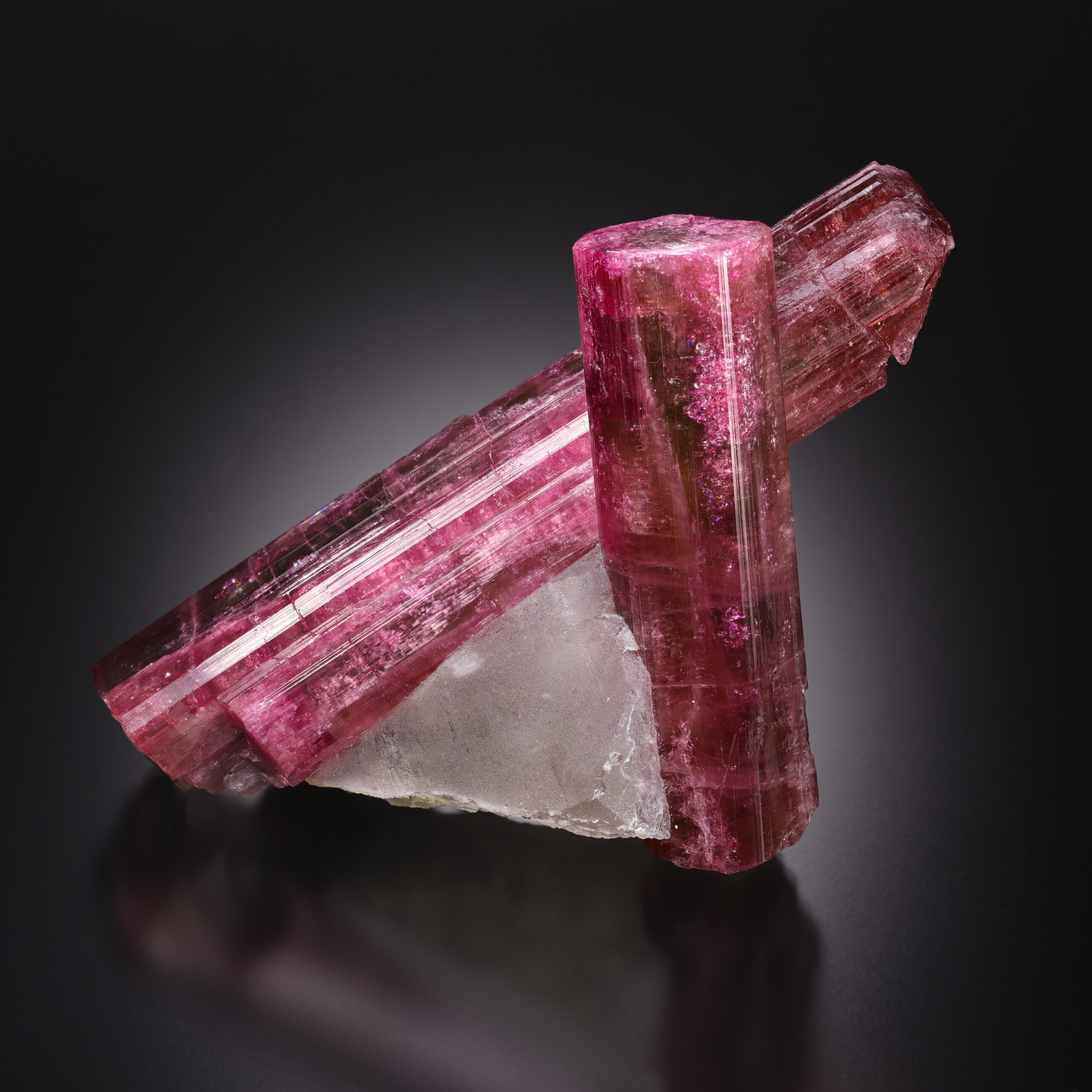 Gorgeous cluster of deep-red gemmy rubellite tourmaline crystals on minor smoky quartz matrix from the famous Barra do Salinas locality in Brazil. Fantastic aesthetics, great color, and good transparency make this a very nice Brazilian tourmaline from older finds. Two repairs (to the left crystal) have been professionally done in a mineral lab and are invisible to the naked eye. Fantastic tourmaline! Mark Cross photos.