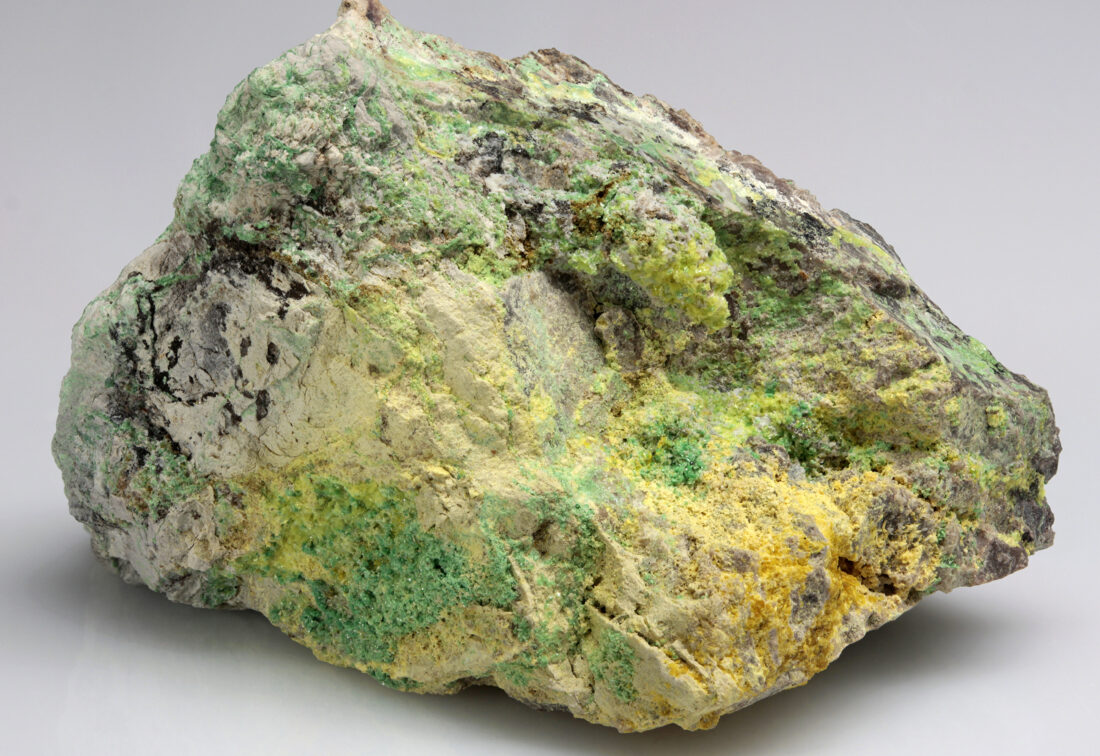 Rich, showy, unusual Musonoi mine specimen consisting of altered siliceous dolostone matrix with abundant yellow saléeite microcrystals, green metatorbernite crystals and acicular yellow-orange sklodowskite crystals in voids. There may be oursinite in here as well! Eric Quinter specimen U/Th 0845, pictured on mindat.org. Rare!!