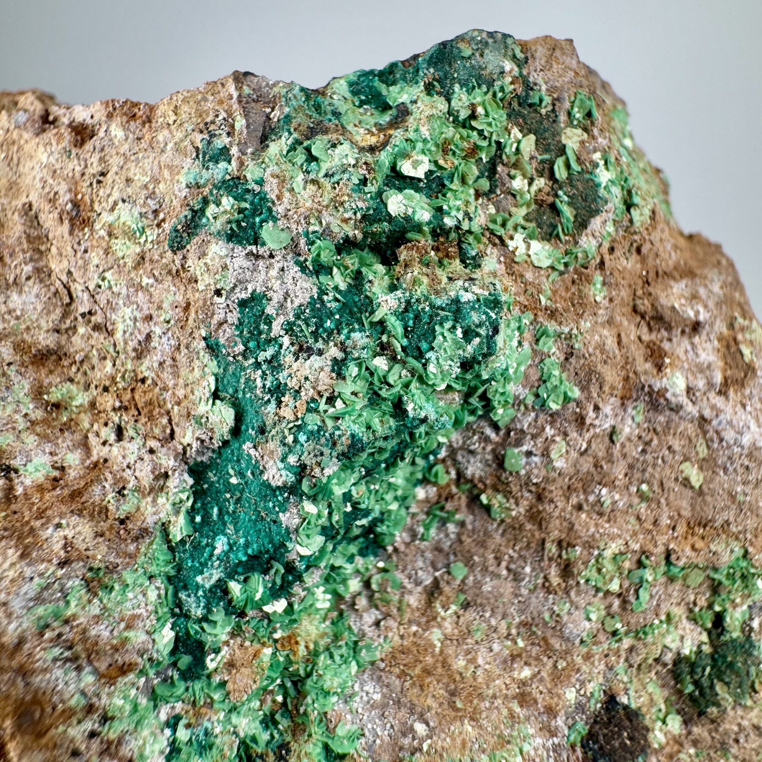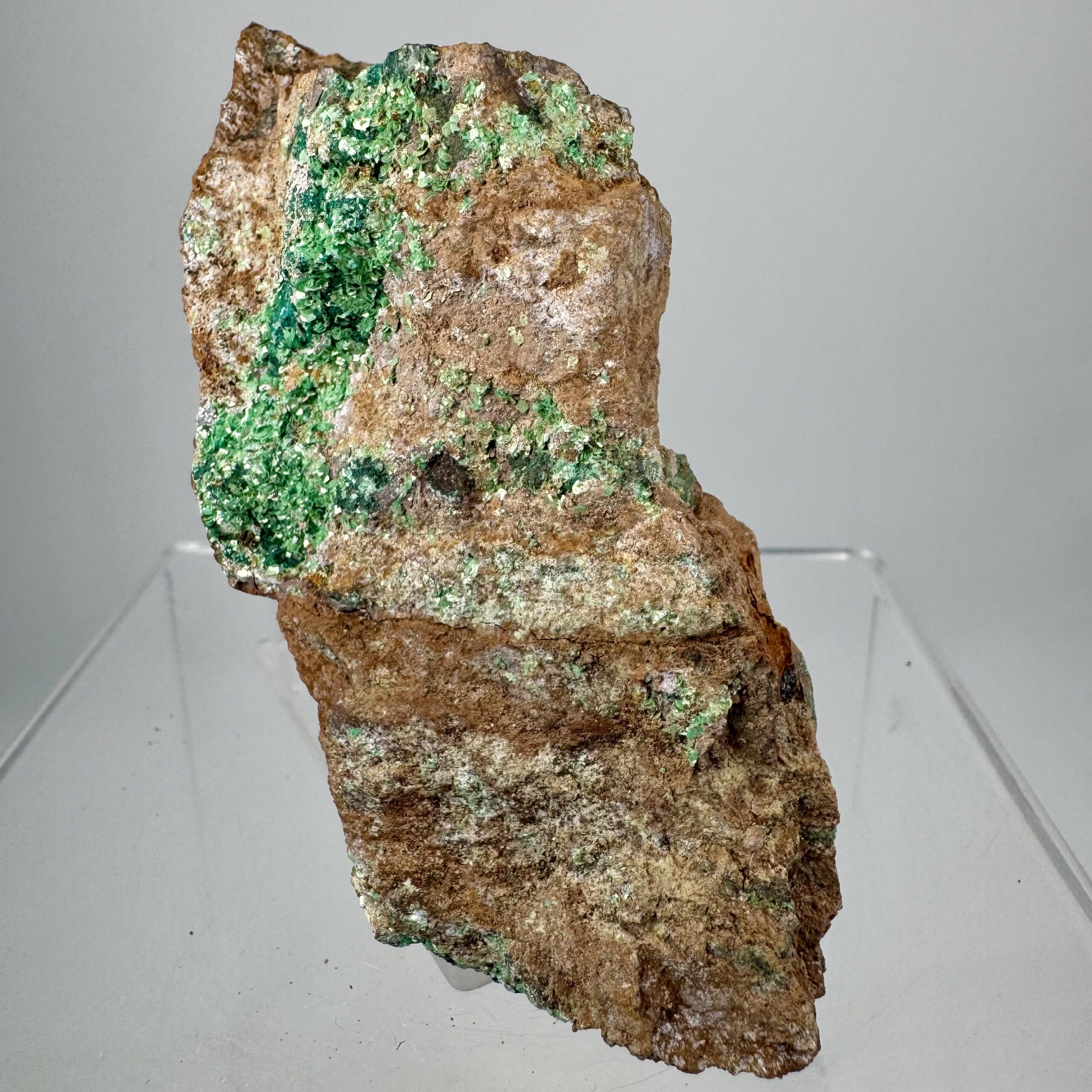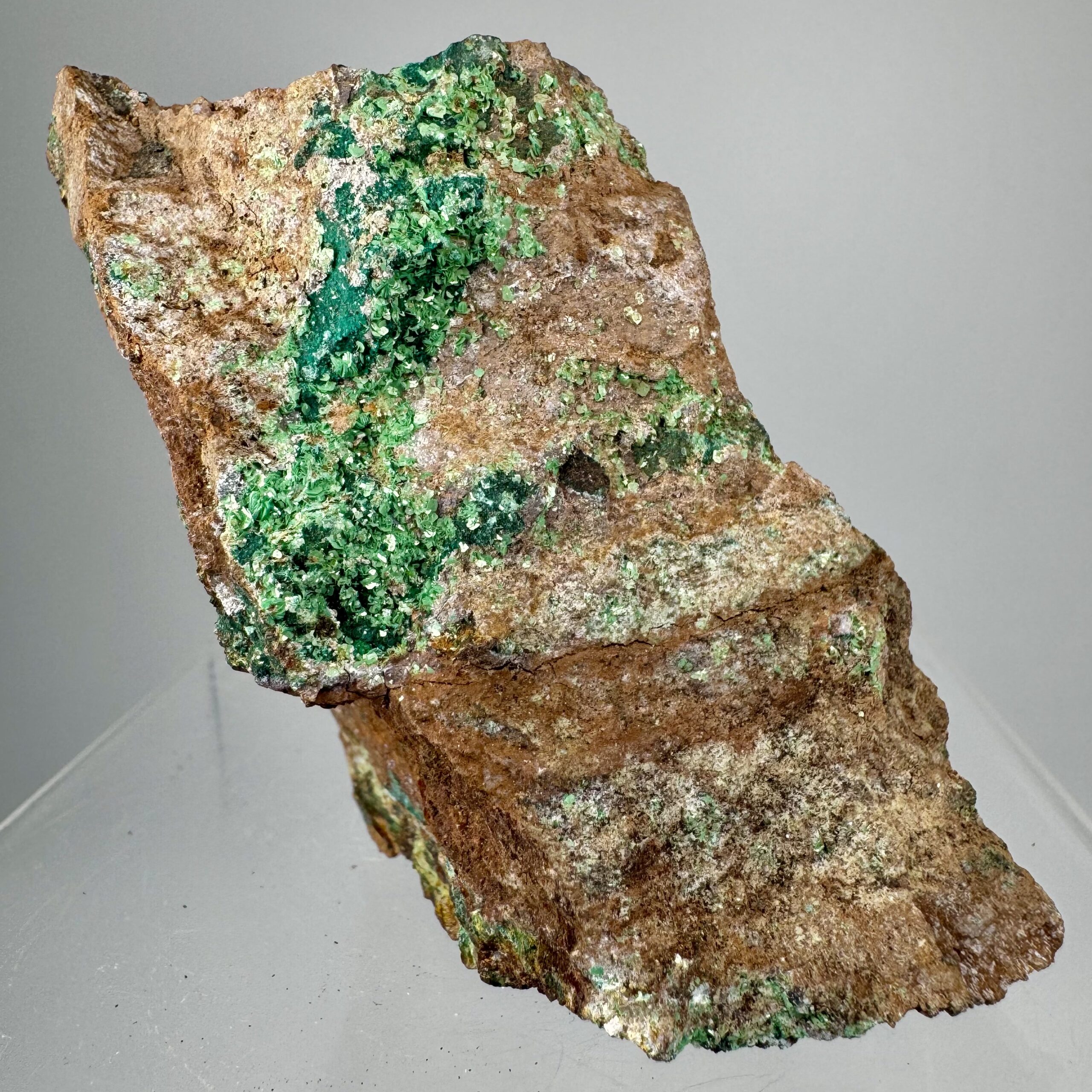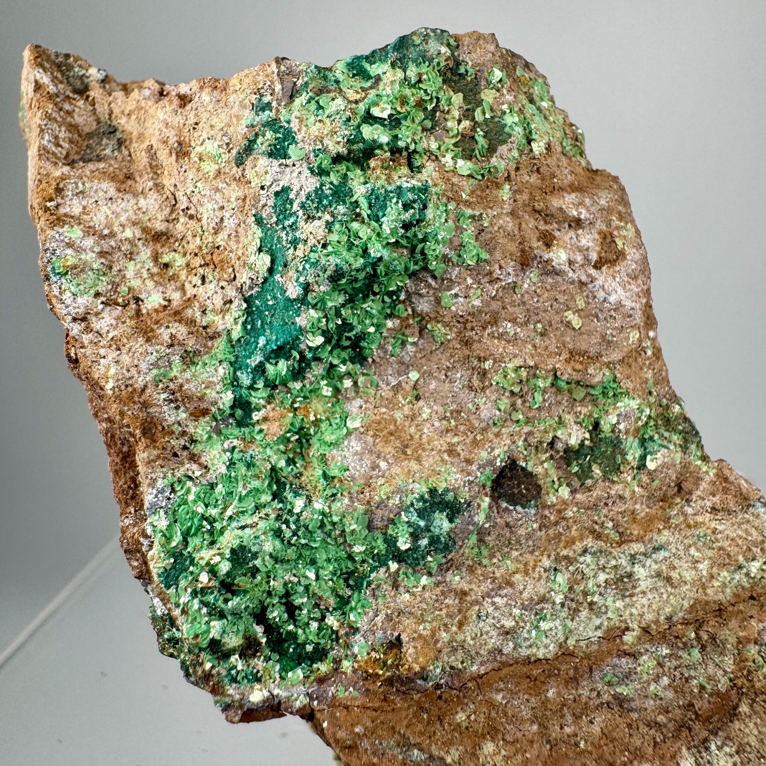 Good rich large cabinet-size specimen of bright green Torbernite on matrix from Alamos, Mun. de Alamos, Sonora State, Mexico. Rare!!