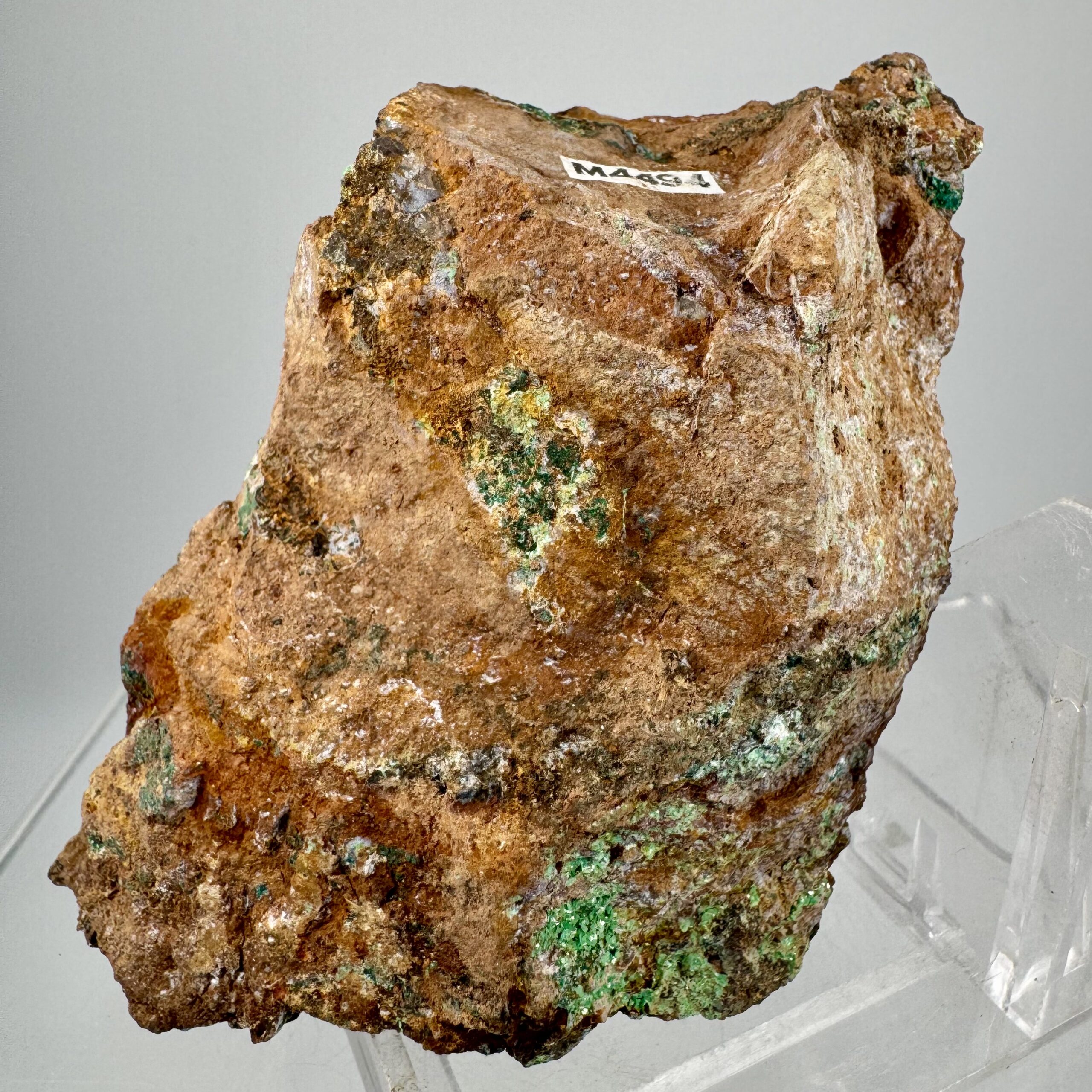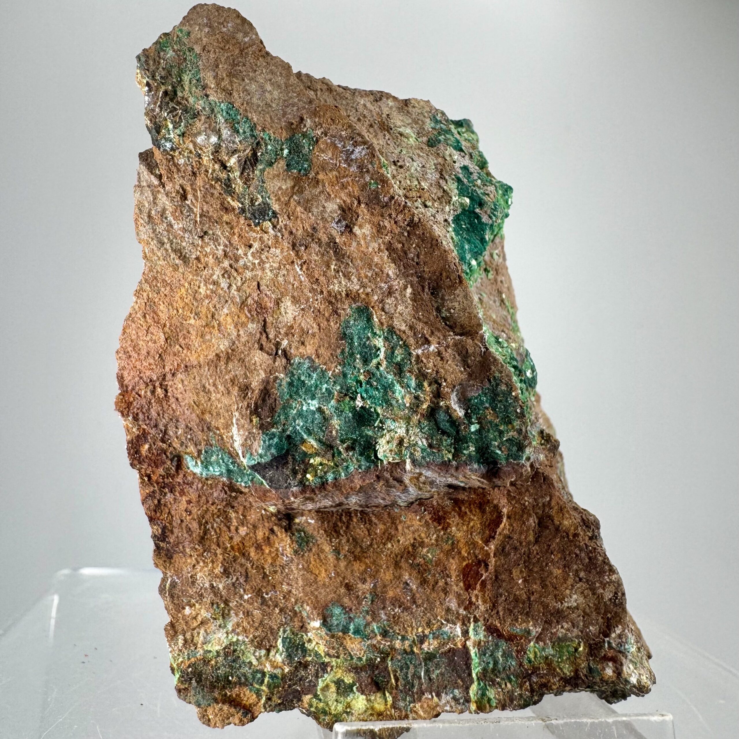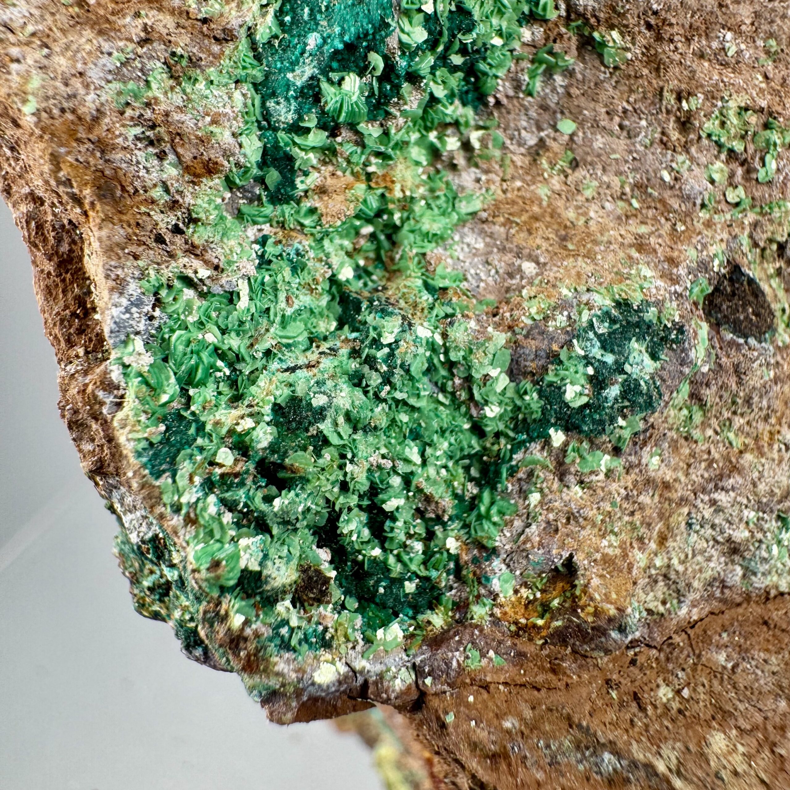 Good rich large cabinet-size specimen of bright green Torbernite on matrix from Alamos, Mun. de Alamos, Sonora State, Mexico. Rare!!