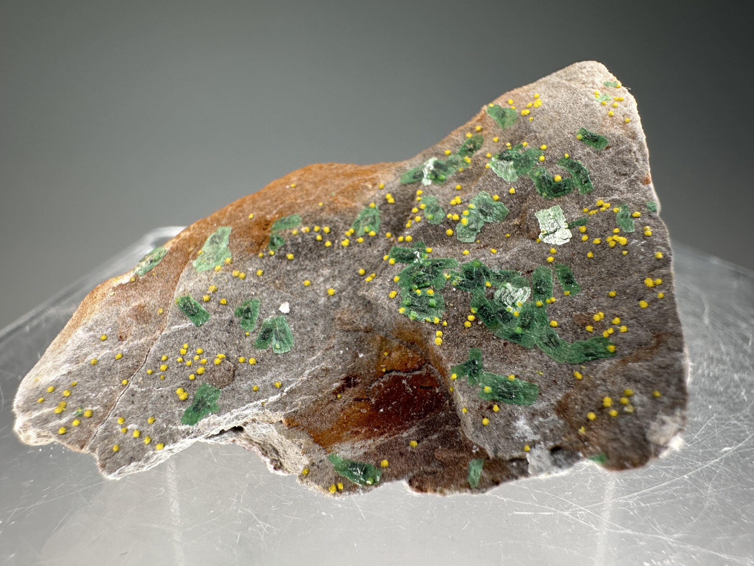 The Qinglong mine, an antimony-gold deposit located in southeast China’s Guizhou Province, is best known for it’s colorful specimens of cyanotrichite, creedite, and fluorite. Despite this, colorful and high-quality uranium minerals are occasionally found, including this small recent find of well-crystallized tyuyamunite and metazeunerite, probably the best yet for the species at the locality! Tyuyamunite is usually just “crust on a rock” at most localities, whereas these are beautiful aggregates of small (~1 mm.) but sharp brilliant yellow tyuyamunite crystals, associated with emerald-green metazeunerite crystals, some of which are strikingly color-zoned.