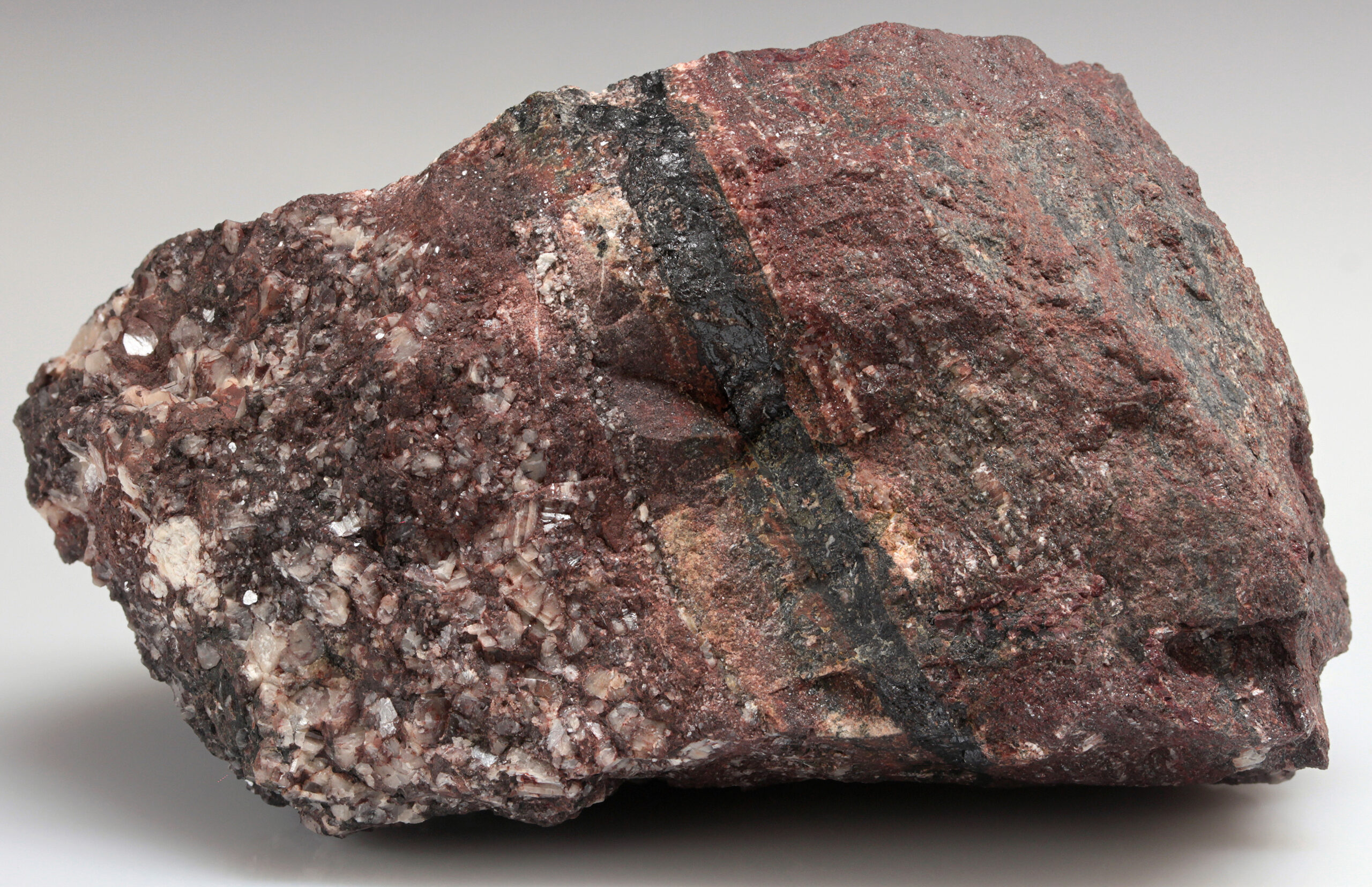 Very nice cabinet-size specimen of abundant black pitchblende forming veins in hematite-stained carbonate (dolomite/calcite) matrix from Petrovice, Nové Mesto na Morave, Zd’ár nad Sazavou District, Vysocina Region, Czech Republic. Coll. # U/Th 0435, Ex. Eric Quinter Collection. Rare!!