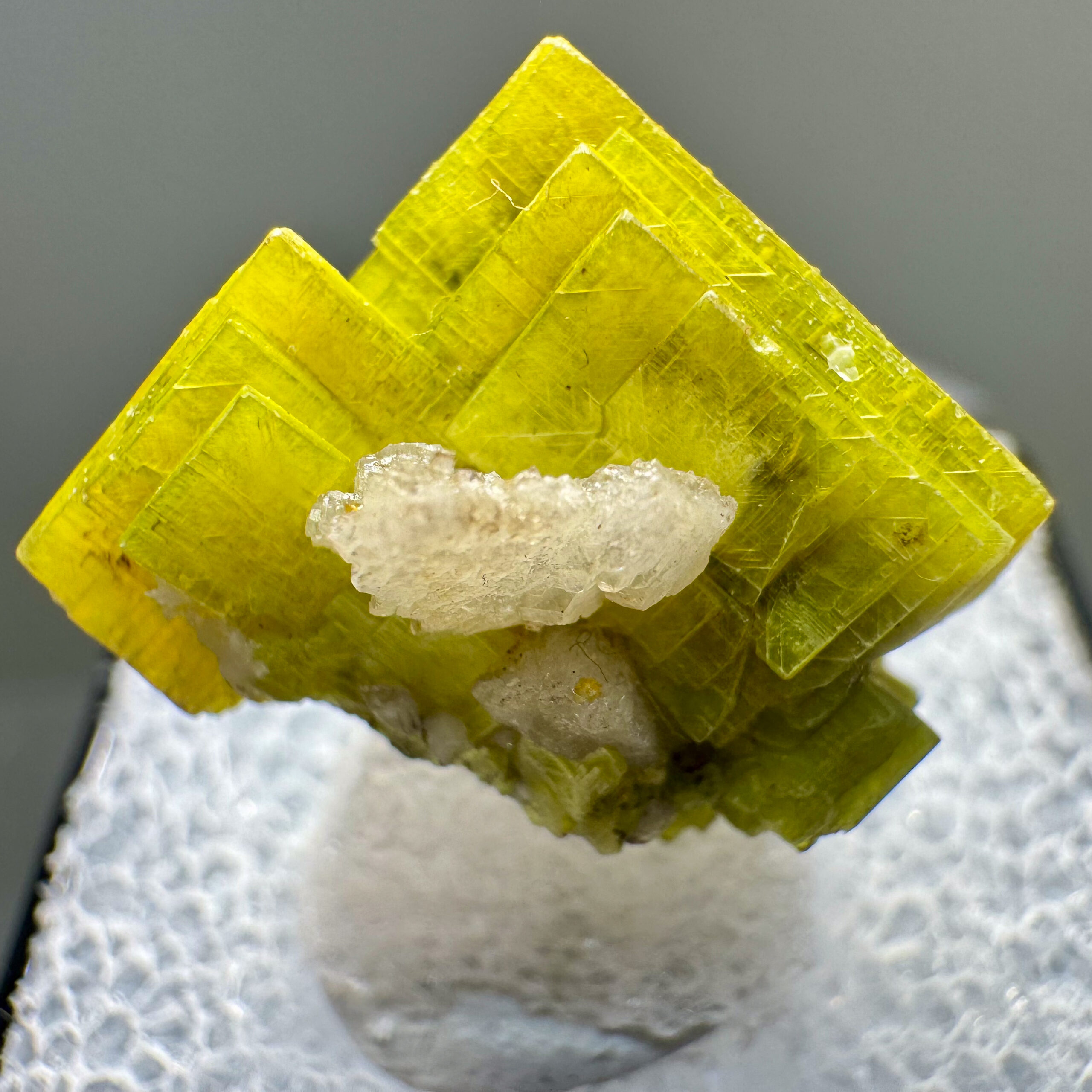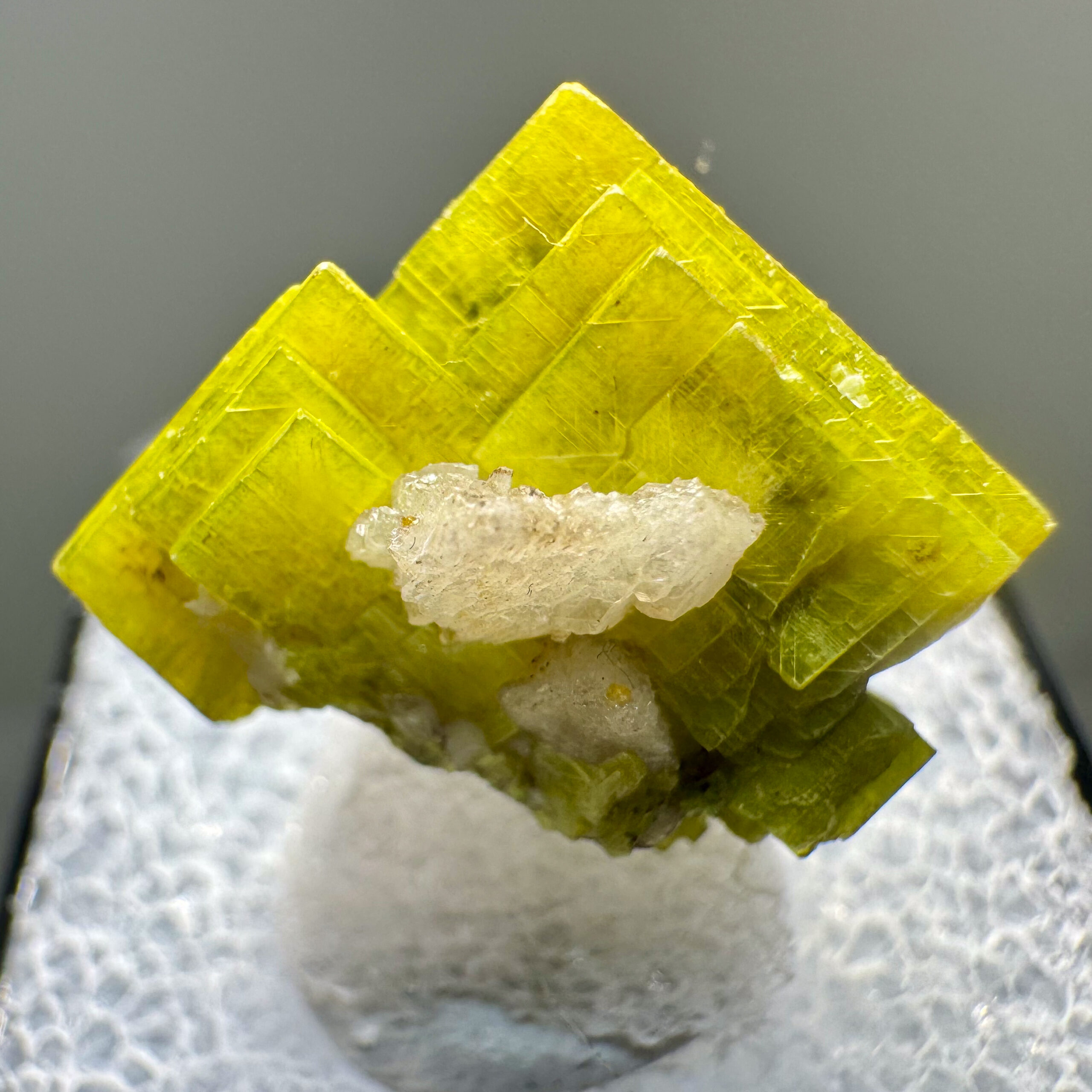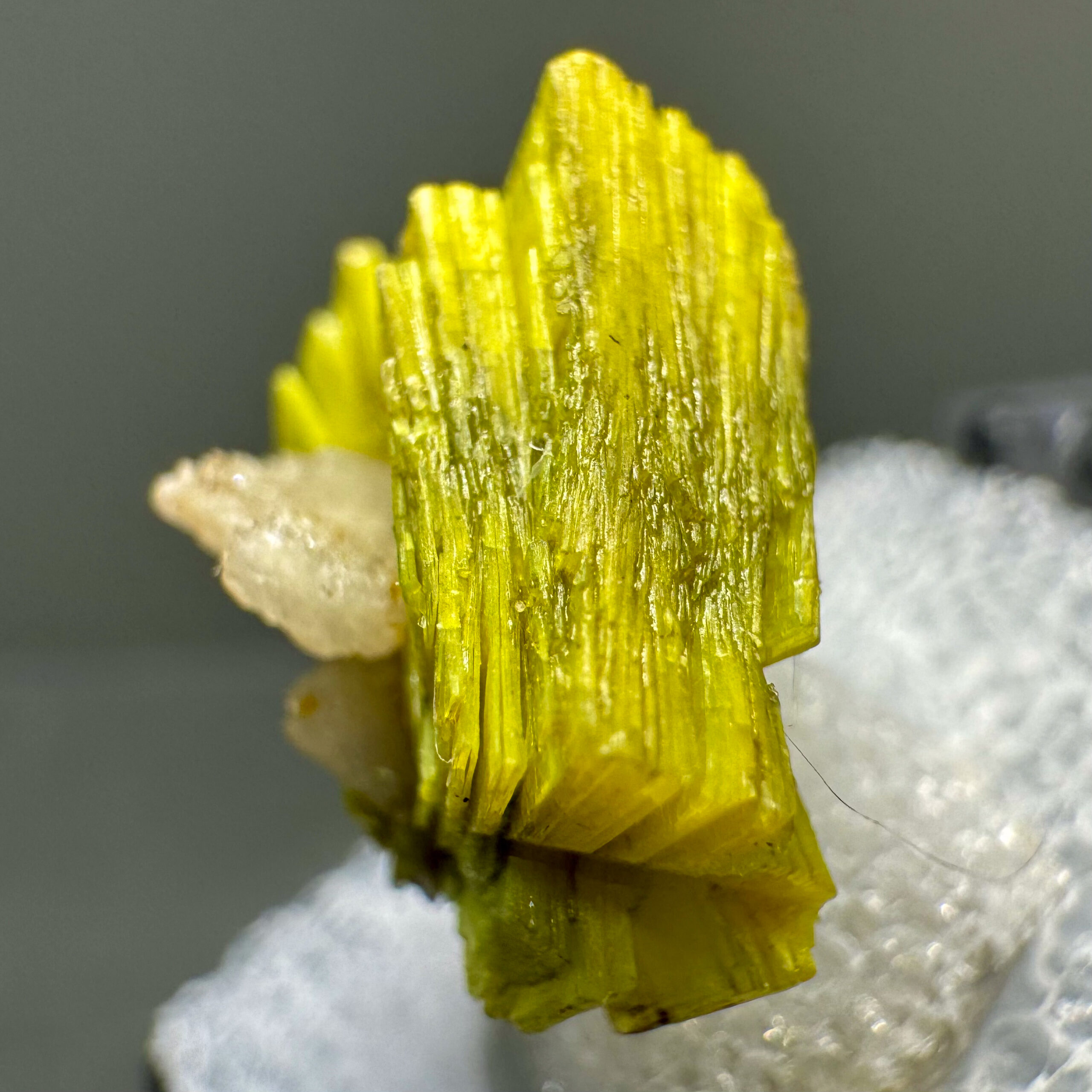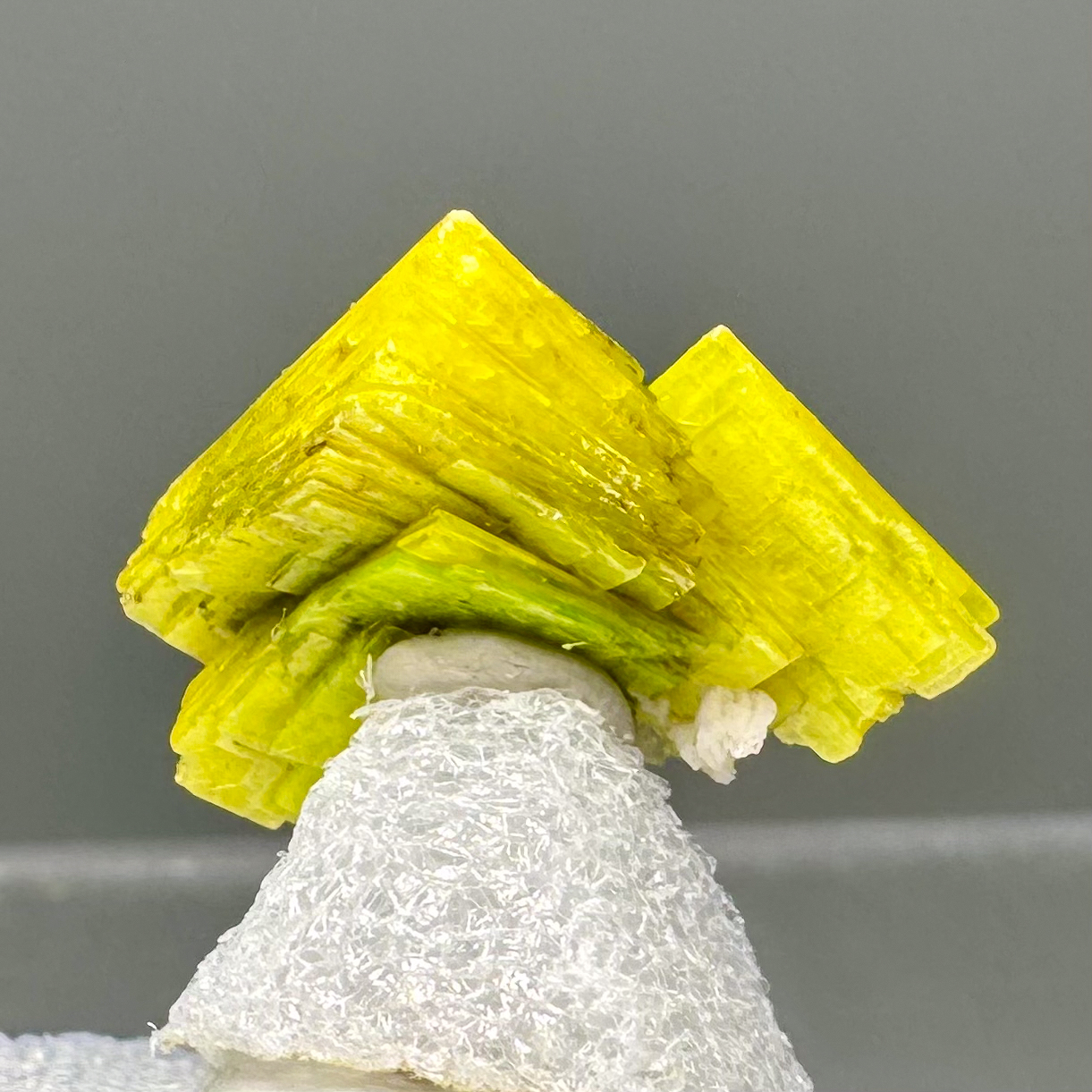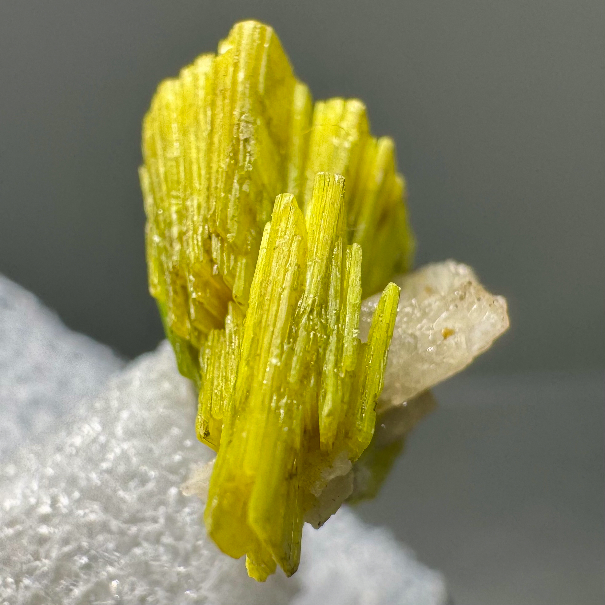 Superb thumbnail-size specimen of very sharp, fairly large, bright yellow-green Uranocircite crystals from the major find around fifteen years ago at the Sao Pedro Claim, Malacacheta, Minas Gerais, Brazil. Very high-quality thumbnail for the species!
