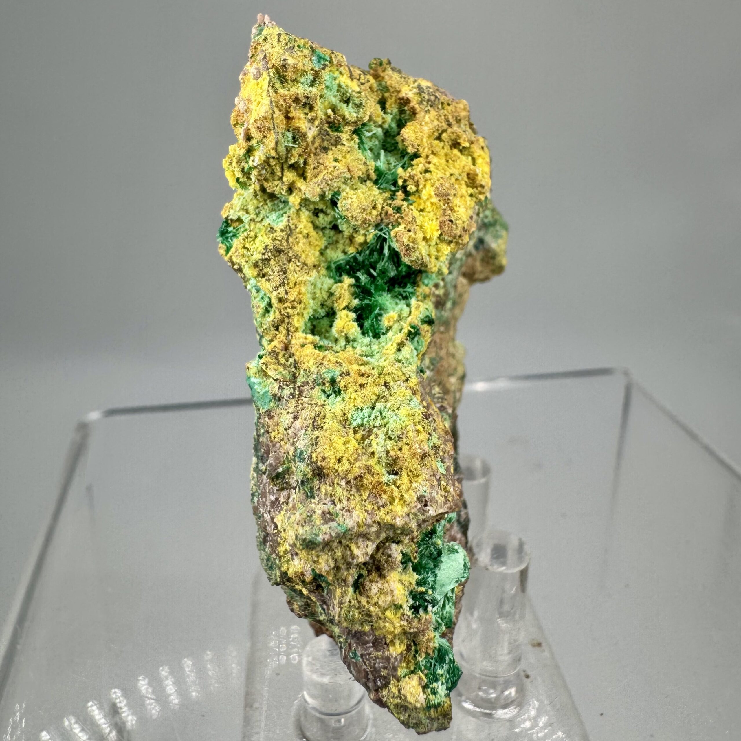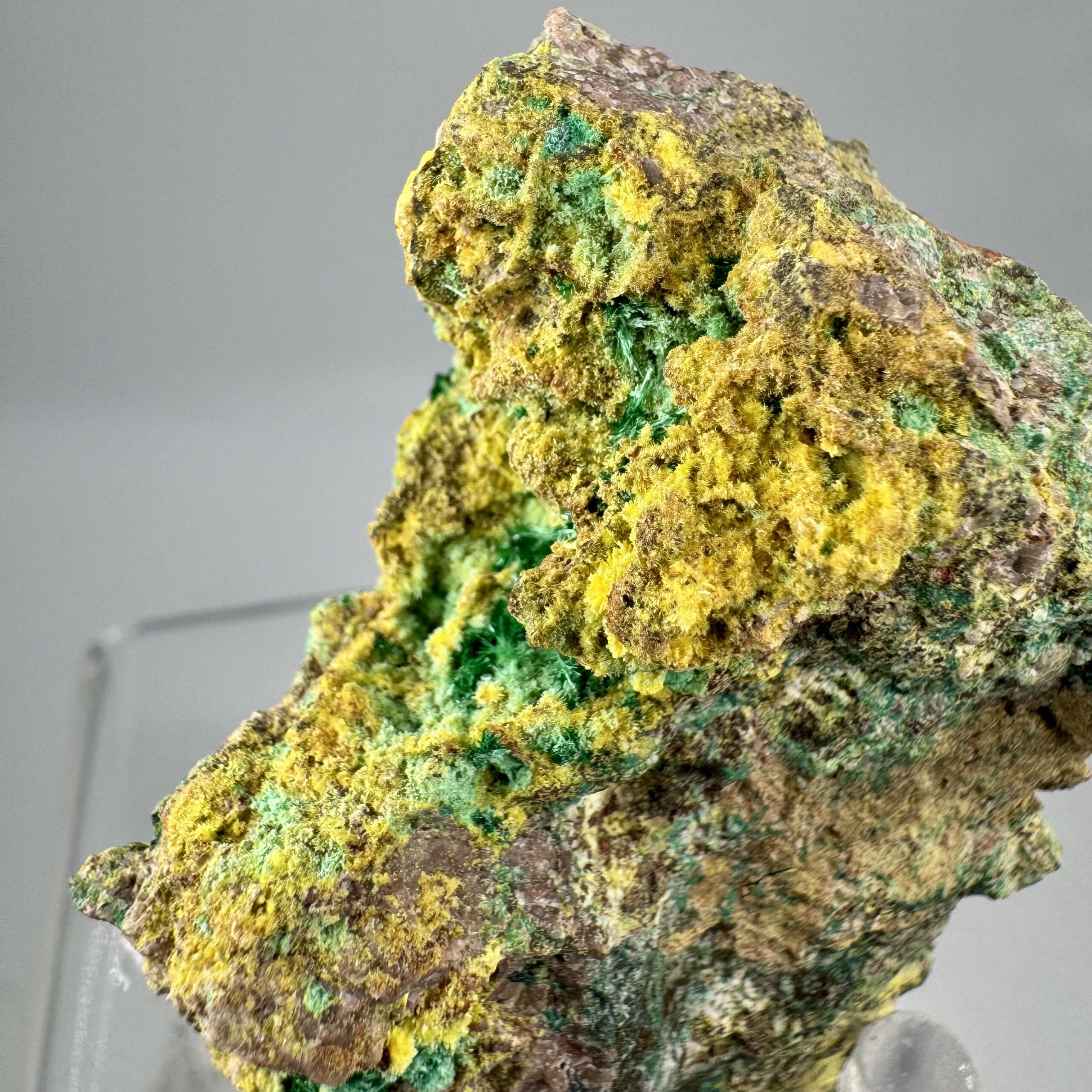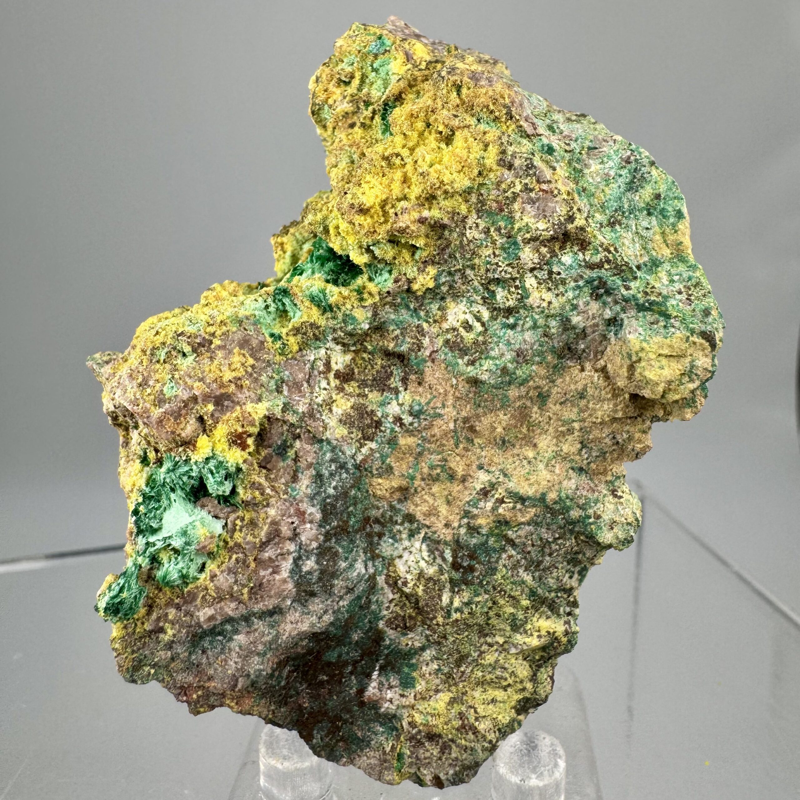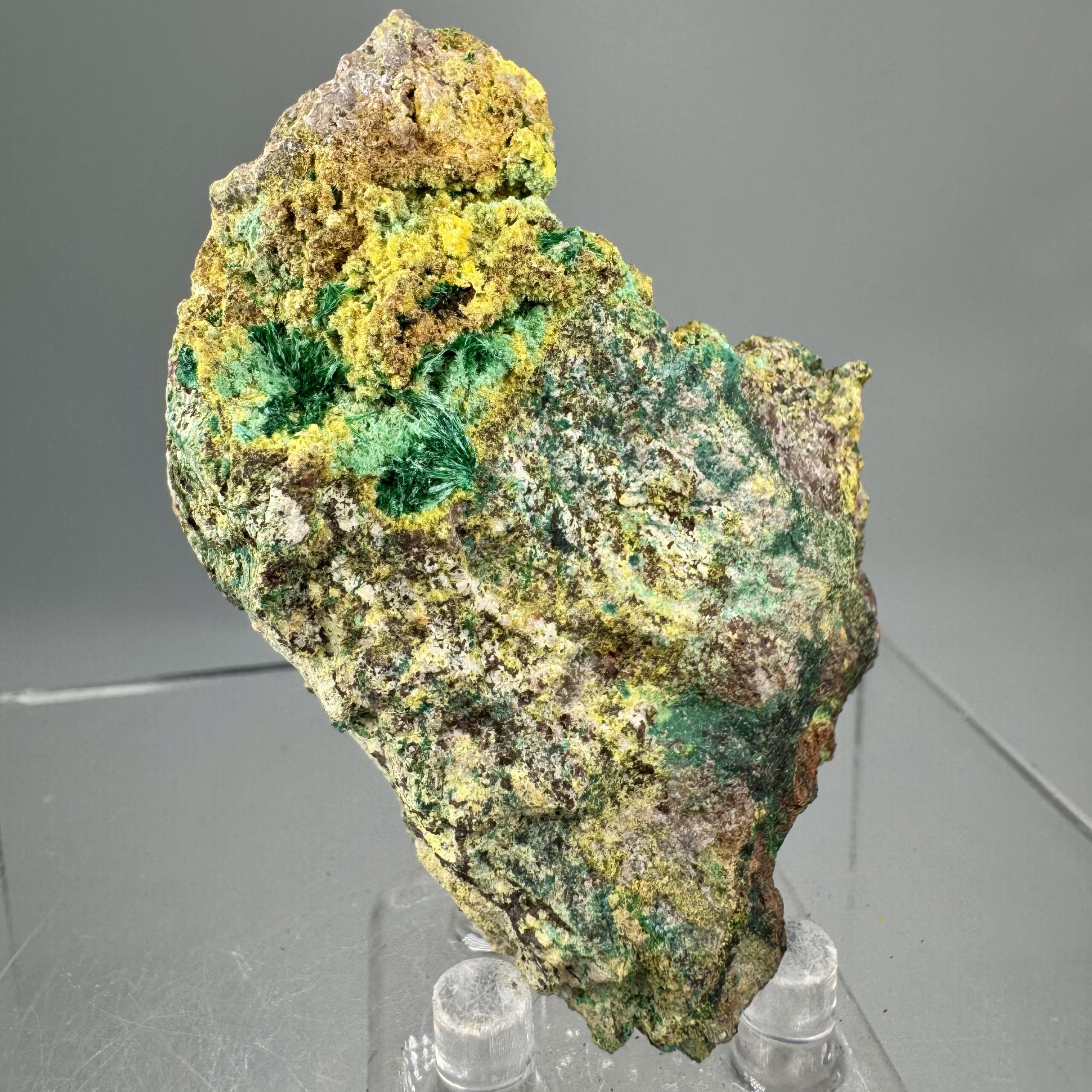 Excellent, colorful, well-crystallized specimen of Uranophane, Cuprosklodowskite, and Malachite in altered Digenite matrix from the famous Musonoi Mine, Kolwezi, Mutshatsha, Lualaba, DR Congo. Fine Musonoi mine specimen, excellent under the microscope or loupe! This material is getting quite hard to come by these days! This was originally in the collection of noted Belgian mining engineer and mineral dealer Henri Vandormael. Rare!