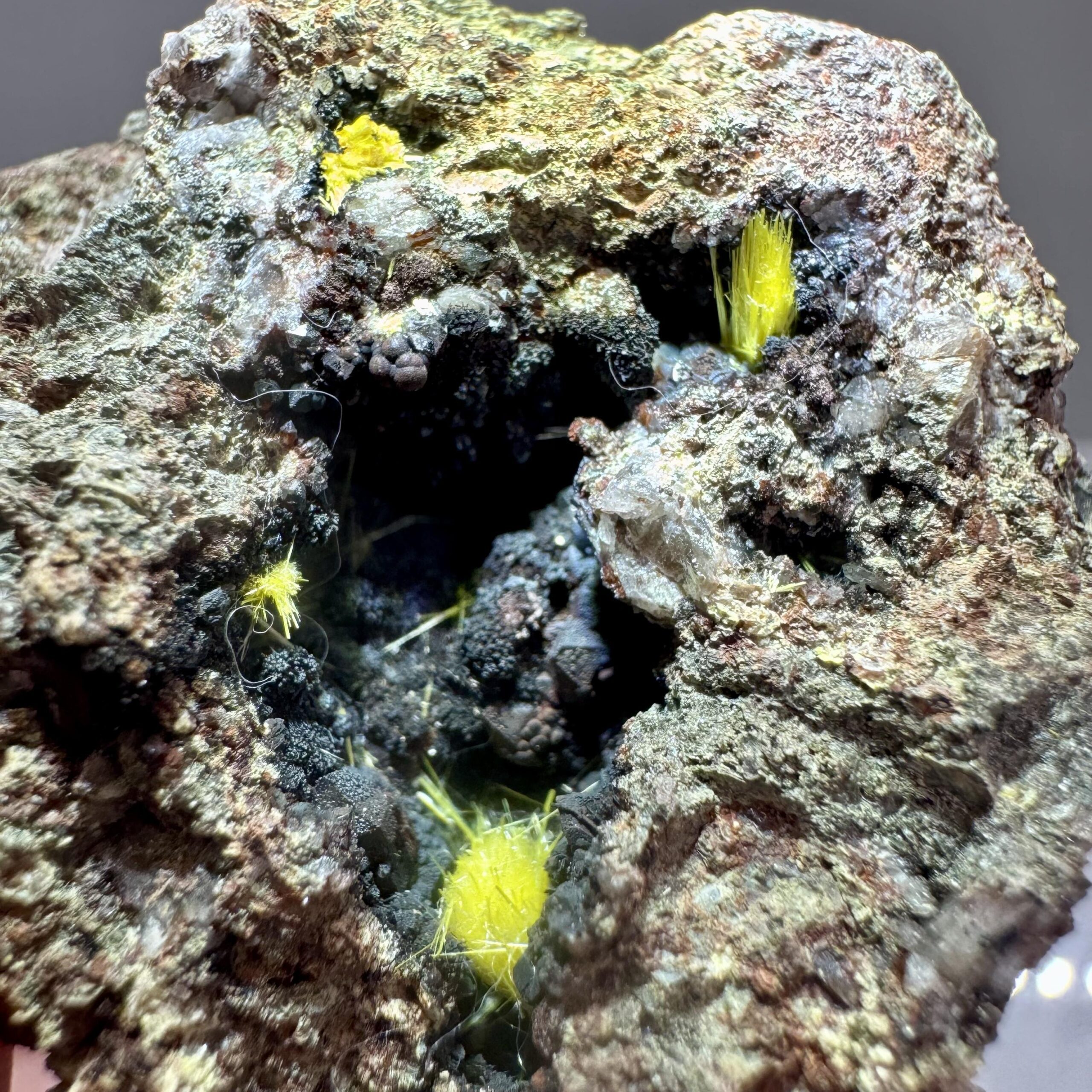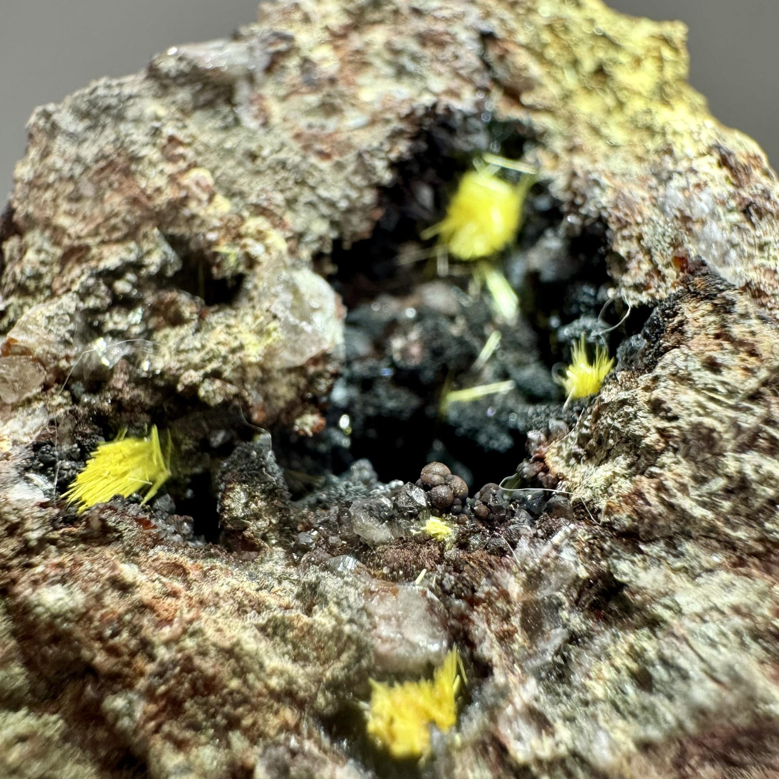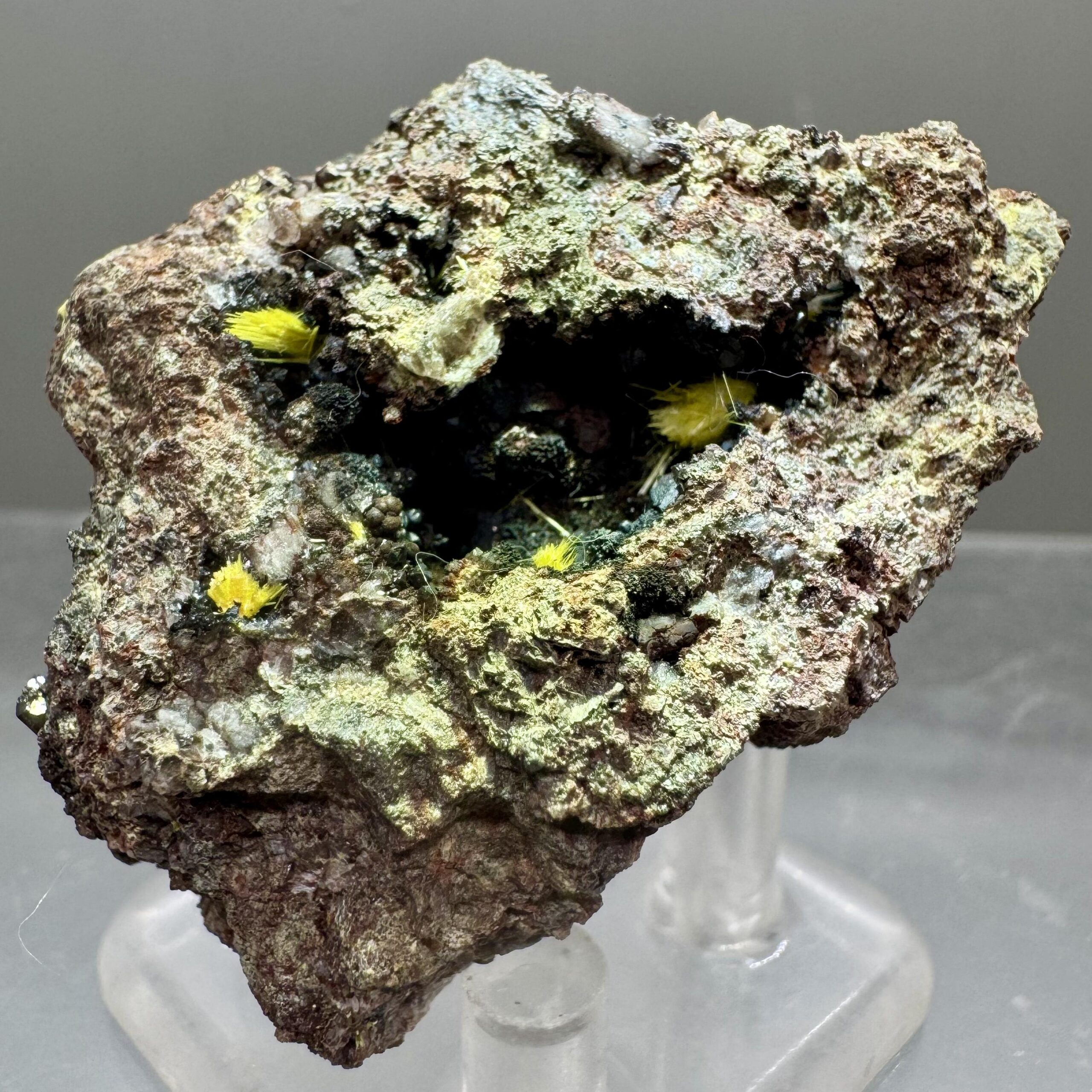 Nicely-crystallized specimen of bright yellow uranophane on iron-rich matrix from the famous Madawaska (Faraday) mine in Ontario Canada. Rare!!