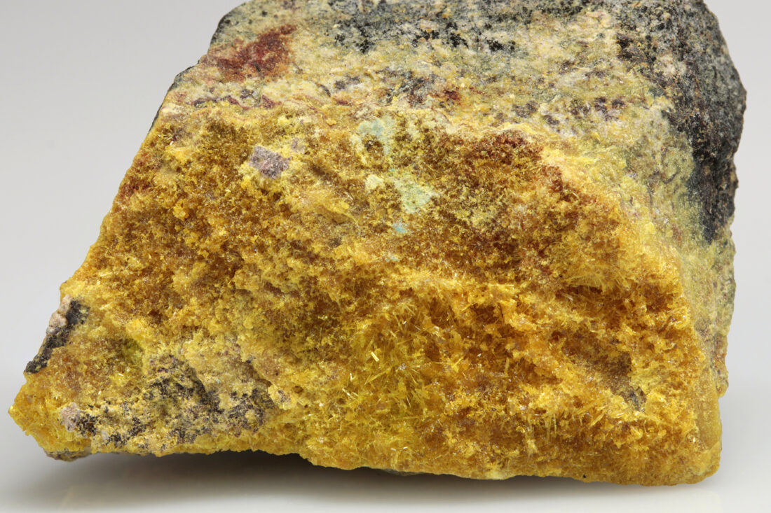 Showy, rich specimen of well-crystallized brilliant canary-yellow uranophane crystals digenite in siliceous dolostone matrix. Eric Quinter specimen U/Th 1118, pictured on mindat.org. Rare!!